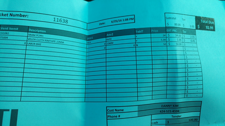 체인도 마침 갈 시기가 왔기에 체인이랑 스포크 교체를 요청했다. 엄청 꼼꼼하고 친절하게 봐주길래 감동 받았다... 영수증을 받기 전까진. 공임비를 무려 50달러나 메겨서 100달러 가까이 나왔다. 어쩐지 친절한데 이유가 있었다. 친절은 돈이다.