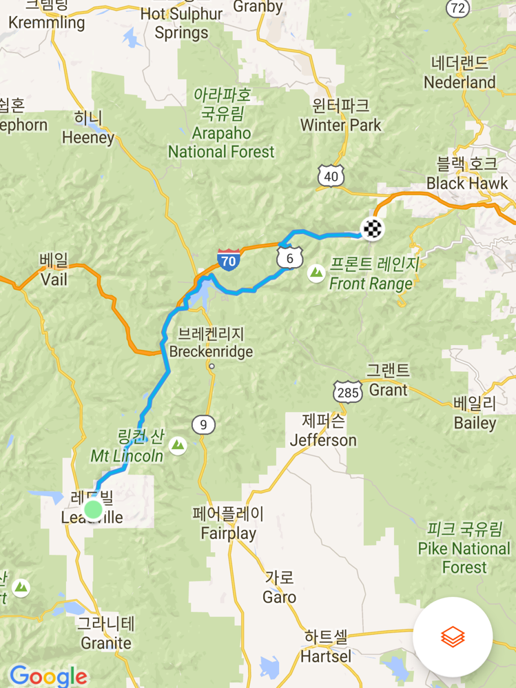 덴버까지 가는 거리는 200km 좀 안 되는데 중간에 로키 산맥을 한 번 더 넘어야한다. 일단 여기서 100km 남짓 떨어진 Georgetown에 저렴한 에어비엔비 호스트와 예약을 잡았다.