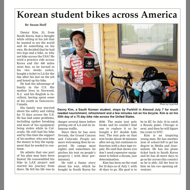 PS. 캔사스를 지나 보니 생각보다 언덕이 많다는 것을 느꼈다. 북쪽이 좀 더 지형이 불규칙적이라곤 하는데, 자전거라서 완만한 언덕이더라도 전부 다 느껴지기에 더 그렇게 생각하게 되는 것 같다.