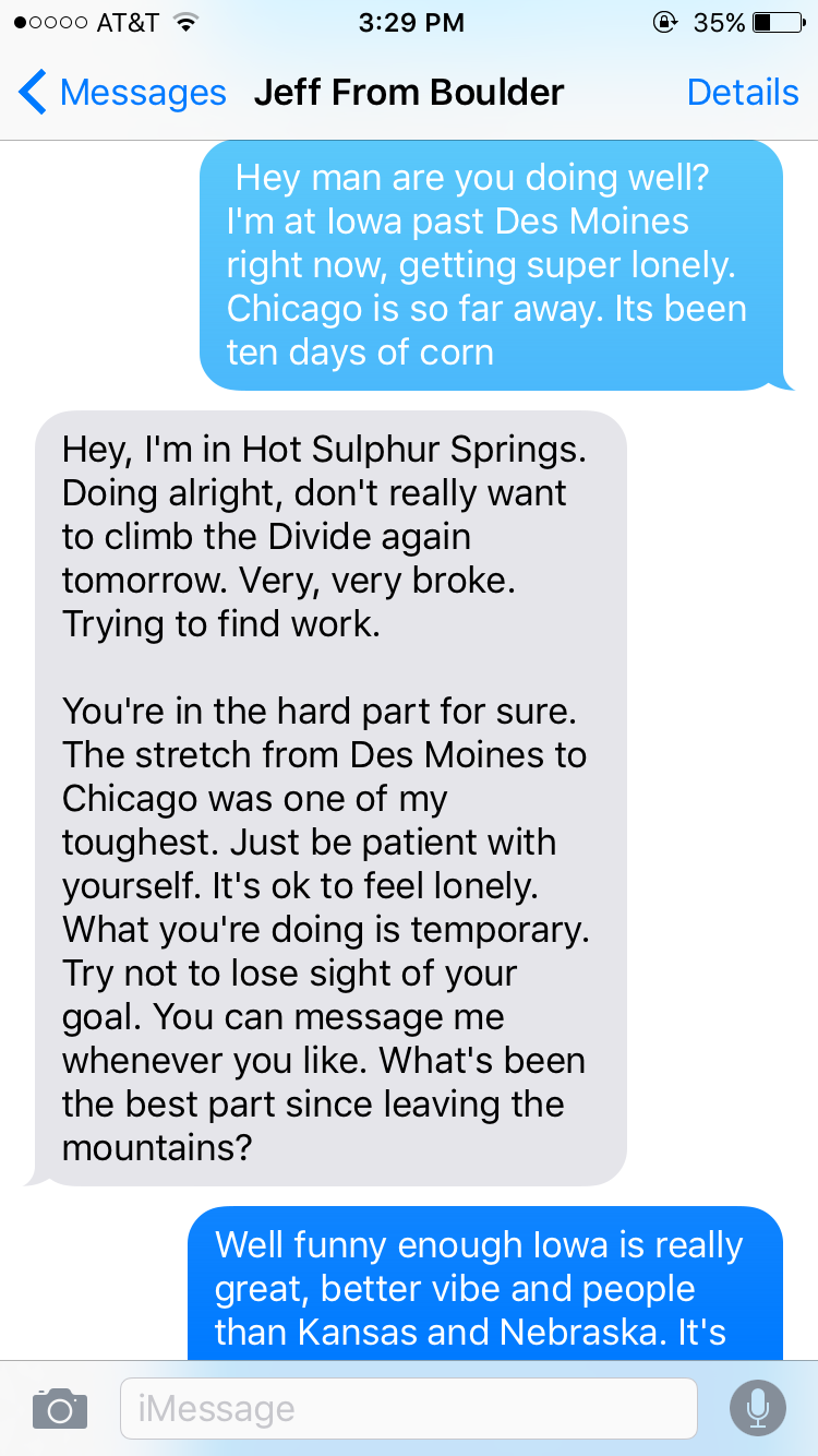 다행히 오늘은 기분이 좀 괜찮아졌다. 어제 하도 힘들어서 콜로라도에서 만난 Jeff랑 문자를 하기도. 서로 혼자 자전거 여행하는 게 얼마나 외로운 일인지 잘 알기에 가끔씩 문자로 얘기를 나눈다.
