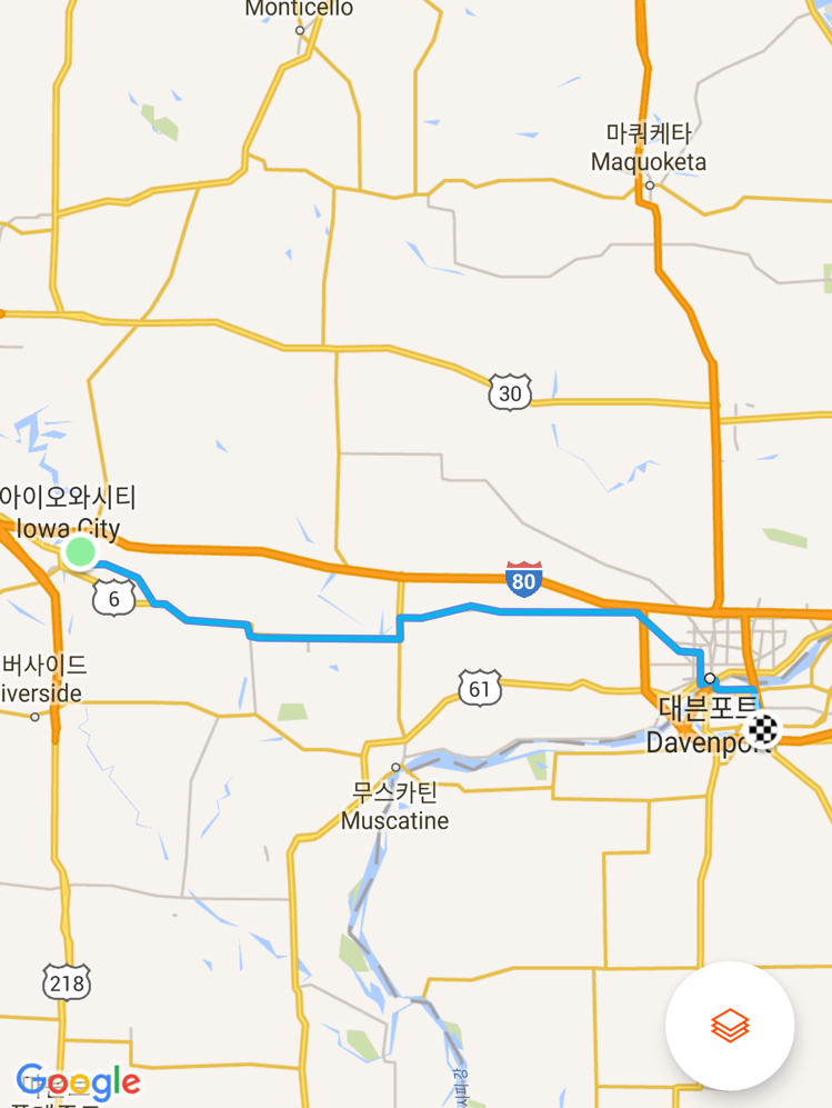 한 11시쯤 비가 그쳐서 그때 출발. 오늘은 아이오와와 일리노이주의 경계에 있는 Davenport라는 도시로 간다. 한인교회가 있길래 한식당도 있을 줄 알았지만 몇 년전에 망했다고 한다ㅠㅠ.