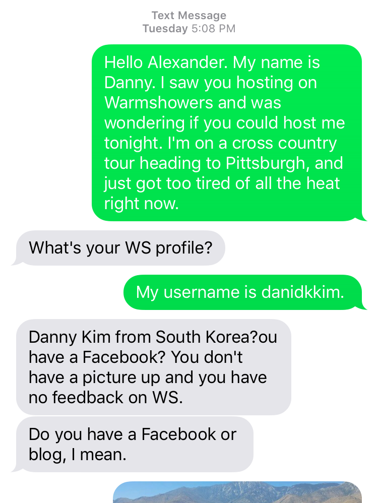 급하게 주변 Warmshowers 호스트 몇명한테 문자를 보냈다. 사실 평일 낮 4시라 답장이 올거라 기대도 안 했는데 신기하게도 한 명(Alex)이 바로 답장했다. 그리고 몇 가지 질문을 더 한 뒤(여태 만난 호스트 중 가장 신원확인이 까다로웠다) 바로 집으로 와도 좋다고 문자를 했다.
