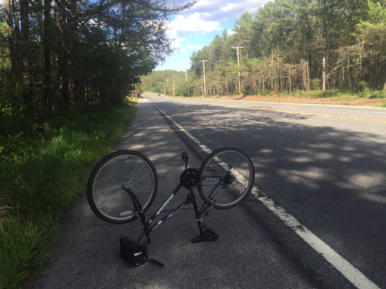 그렇게 아픔을 참고 달리다 보니 갑자기 뒷 바퀴에서 이상한 느낌이 났다. 아니 이런 펑크가ㅠㅠ 나는 당연히 3일 정도는 버티겠지 싶어 돈이라도 아끼고자 예비튜브를 안 샀었다. 게다가 바퀴가 퀵 릴리스가 아닌 볼트와 너트로 조여저 있어 뺄 수도 없다.