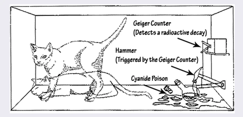 그렇게 계속해서 들어가면 우리가 미시세계에서 얻을 수 있는 것은 무엇인가? 원자가 그곳에 존재할 확률이다. 실제로 미시세계에서는 확률로 모든 것이 돌아가는 지점이 나타나게 된다. 뉴턴역학과 아인슈타인의 상대성이론 이후 이런 불확정성, 확률론적에 대한 기존 과학계는 거부감이 심하였다. 아인슈타인의 유명한 말 "신은 주사위를 던지지 않는다"라고 하였으며 슈뢰딩거는 확률론적인 주장을 비꼬기 위해서 사고 실험을 한 가지 제안하는데 그것이 바로 슈뢰딩거의 고양이 사고 실험이다. 실험의 내용은 다음과 같다. 상자 안에 고양이 한 마리와 50%의 확률로 붕괴되는 원소 장치와 원소가 붕괴되는 것이 감지되면 독극물이 깨져서 나오는 장치가 있다고 하자. 그렇다면 고양이의 생존 확률은 몇% 인가? 확률론적으로 말하면 고양이의 생존확률은 50%인데, 그렇다면 고양이는 지금 죽은 상태인가? 살아있는 상태인가? 아니면 죽은 상태와 살아 있는 상태가 공존하고 있는 것인가? 우리는 죽은 상태와 살아 있는 상태는 쉽게 생각할 수 있지만 죽어있으며 살아있는 상태가 공존하는 건 생각하는 것조차도 어렵다. 하지만 확률론적으로는 이게 정답이다. 여기에서 관찰자가 상자를 열어서 고양이가 살아있는지 죽어있는지 확인할 때에 고양이는 생존확률 50%에서 100%(살아있음) 또는 0%(죽어있음)로 어느 한 가지 상태가 확정이 된다. 이 것을 두고 관찰을 하고 있을 때는 중첩되지 않고 확정이 된다는 것이다.