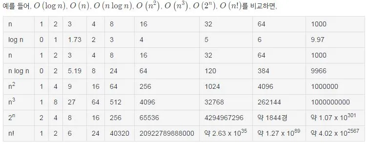 일반적으로 위로 갈수록 알고리즘이 매우 빨라지며, 아래로 갈수록 n의 값이 커질 때마다 급격하게 알고리즘의 수행 시간이 증가한다.