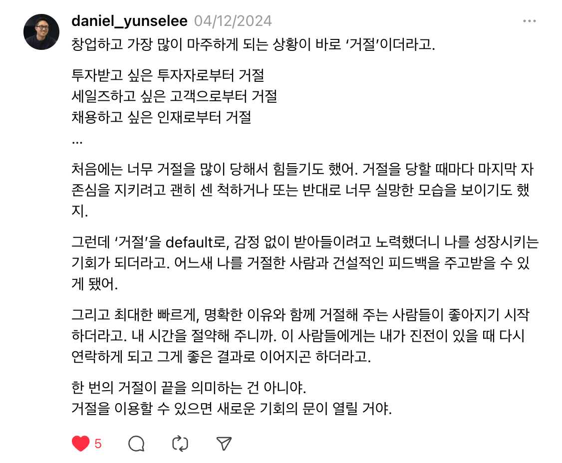 회사의 소셜 계정은 많이 운영해 봤지만, 개인 SNS를 잘 관리하는 편은 아니었다. 남들 다하는 인스타그램도 안 하는 내가 스레드(Thread)를 할 수 있을까 싶었다. 그는 두 가지 이유로 스레드를 추천했다. 페이스북과 다르게 젊은 사람들이 많이 쓴다는 것, 그리고 인스타와 다르게 텍스트에 집중한다는 것이었다.