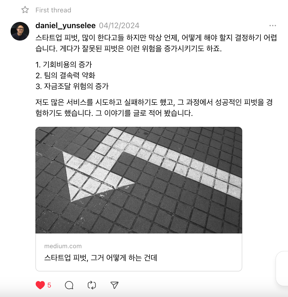 스레드의 의도인가, 우연인가? 두 번째 게시물도 좋아요 5명이다. 새로운 포스팅을 할 때마다 팔로워가 한두 명씩 늘기 시작했다. 게시물에 대한 노출은 평균 하루, 길면 이틀 정도 가는 것 같았다. 매일 게시물을 올려야 팔로워가 늘어나는 구조라는 걸 알게 된다.