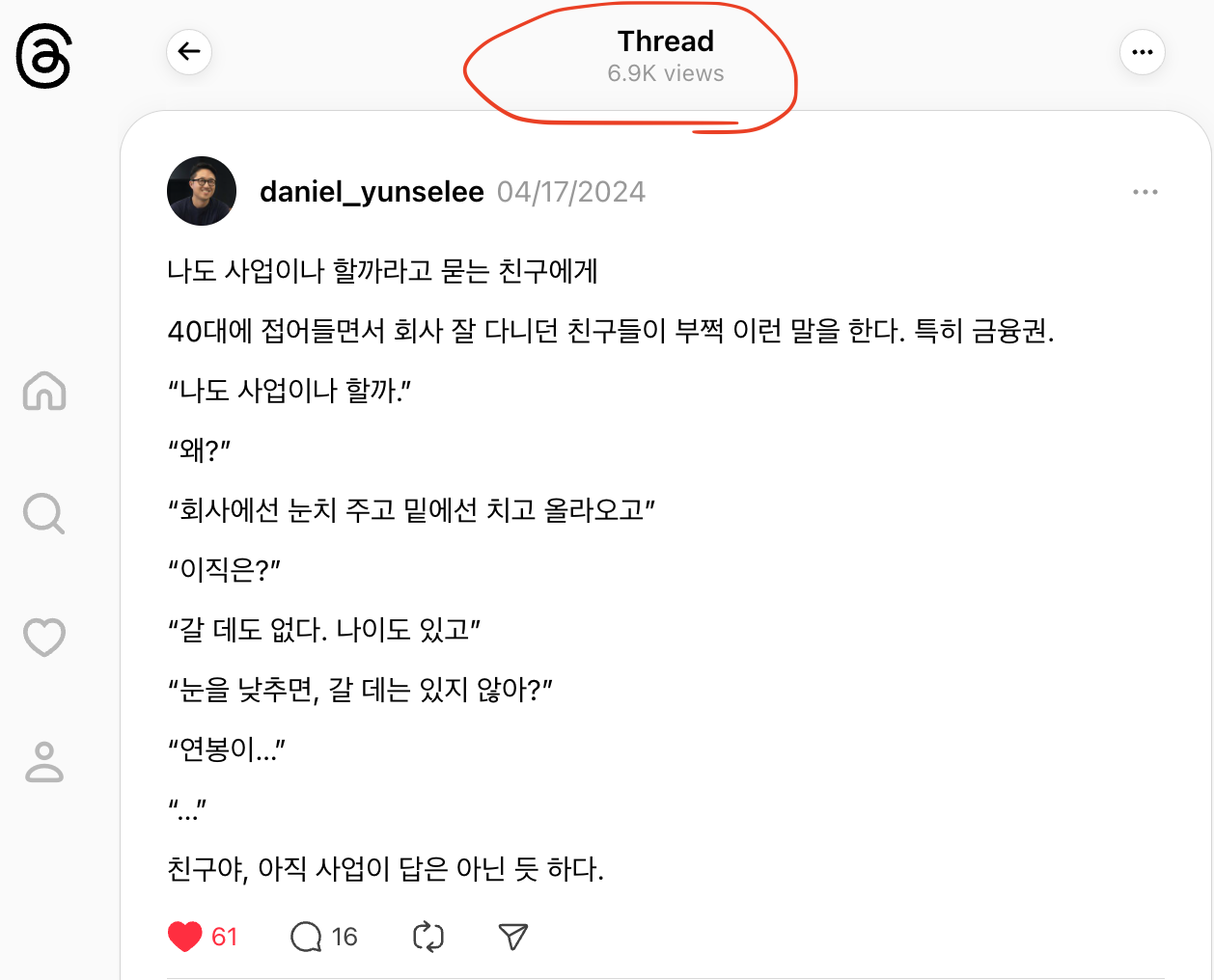 일주일 동안 매일 1~2개씩 포스팅했다. 게시물당 100~200회의 조회수가 나왔다. 그중 한 게시물에서 7,000에 육박하는 조회수가 나왔다. '40'대, '사업'이라는 키워드가 알고리즘의 선택을 받은 걸까? 스레드에서 나름 실적(?)이 좋았던 콘텐츠는 긴 글로 재구성해서 블로그 글로 재작성한다. 이렇게 스레드를 테스트 베드로 사용하며 원소스 멀티유즈를 시작하게 된다.