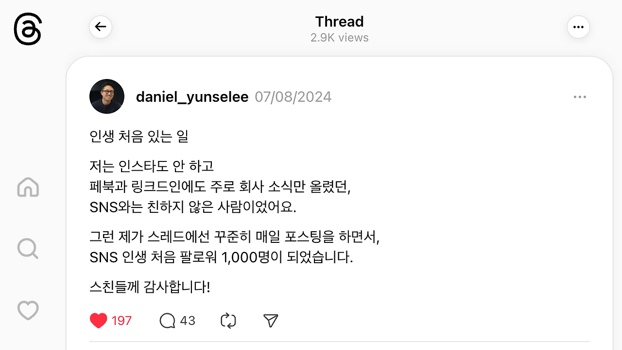 80여 일이 지나자 팔로워는 1,000명을 돌파하게 된다. 하루 2~30분, 짧은 글을 매일 썼을 뿐인데, SNS 인생 처음으로 1,000명의 팔로워를 얻게 된 것이다. 팔로워 1,000명을 자축하는 게시물을 올렸더니 이리도 축하해 주는 스친(스레드 친구)들. 따뜻하다.