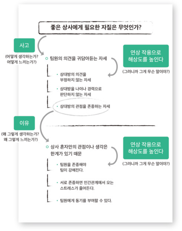저자에게 메모는 단순히 잊지 않기 위한 도구가 아닌, 생각을 표현하기 위한 도구다. 우리의 생각은 뇌 안에서 언어가 아닌 어렴풋한 이미지로 존재한다. ‘감각’ 또는 ‘개념’이라 불리는 상태다. 메모, 즉 글쓰기는 이런 감각이나 개념을 언어로 바꾸는 과정이다. 꾸준한 글쓰기가 생각을 언어화하는 능력(표현력)을 향상하고, 말의 해상도를 높이는 지름길이라는 것이다.