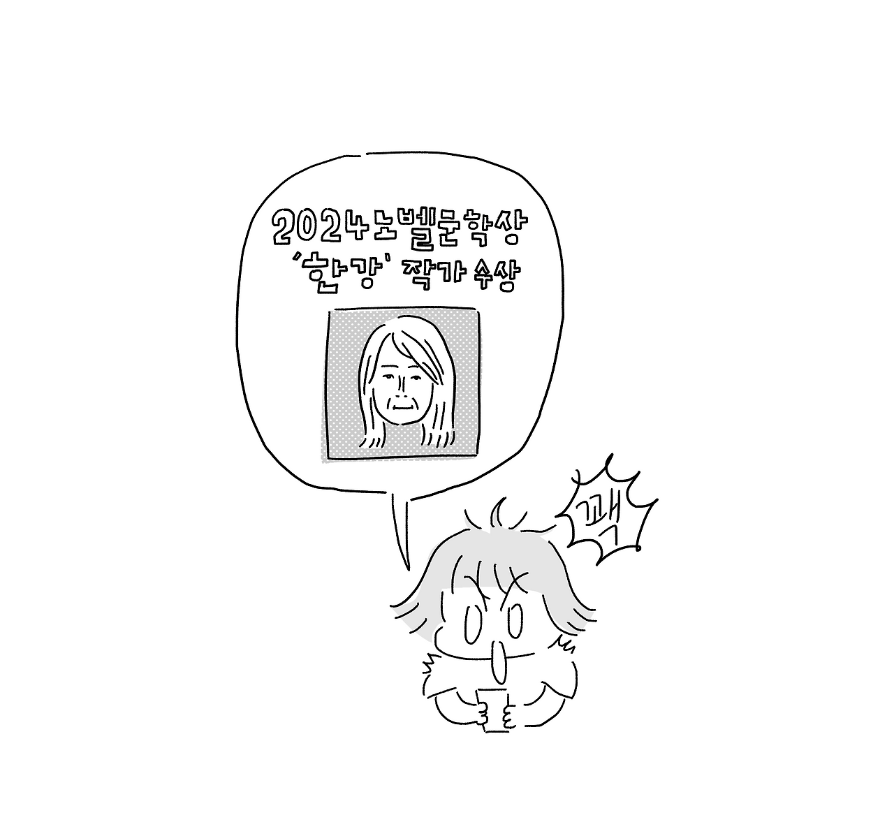 산뜻하게 흘러가던 그날 저녁, 요즘 열심히 보고 있는 예능 프로그램을 보기 위해 OTT 어플을 켜고 침대에 누워있을 때였다. 톡이 하나 도착해서 무심코 봤다가 소리를 꽥 질렀다. 한강 작가가 올해의 노벨 문학상 주인공이라는 소식이었다.