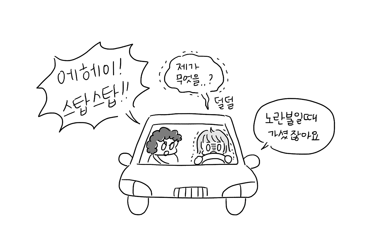 함께 운전대를 잡고 운전하던 아저씨는 나를 보며 황당함을 감추지 않으셨다. 죄송해요. 저는 왜 이럴까요. 엄마는 기다렸다는 듯, 얼른 운전대 바꿔주라고 했다. 그제야 엄마 손에서 꼭 붙잡혀 있던 손잡이가 떨어졌다. 집에 도착해 차에서 몸을 내리는 엄마의 몸이 조금은 삐그덕거렸던 것도 같다.