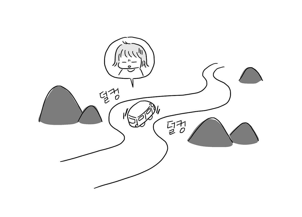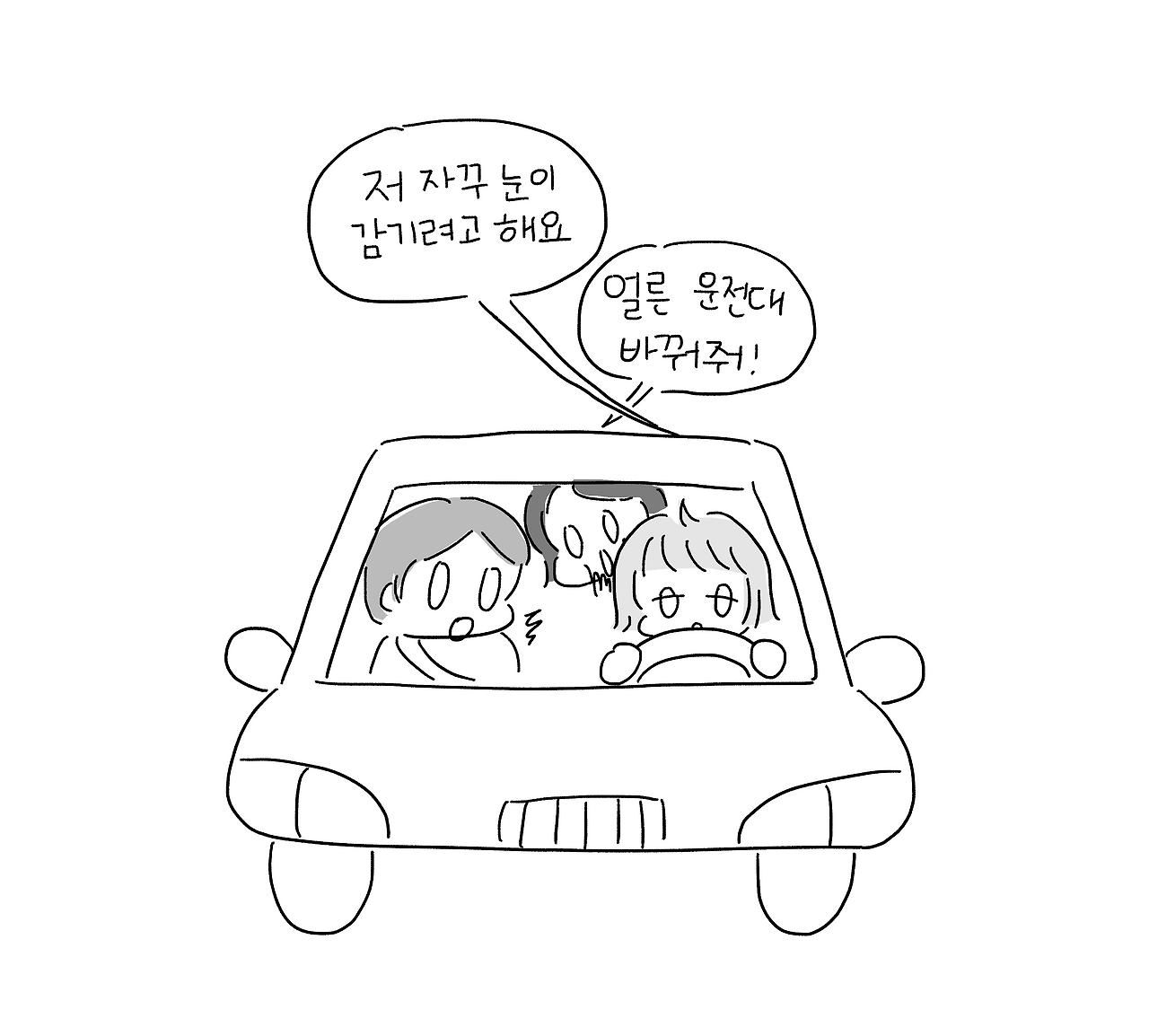 핸들을 잡는 것부터 익숙하지 않은 나로 인해 차가 미세하게 오락가락, 흔들리기 시작했다. 엄마는 창문에 달린 손잡이를 꼬옥 붙잡고 중간중간 ‘끄응.’ ‘커억.’ ‘허억.’ 같은 추임새를 넣어 나를 더 긴장하게 했다. 주차 연습까지 하고 돌아오는 길, 너무 긴장을 많이 한 탓이었을까, 가물가물 졸음이 밀려왔다. 결국 실토했다. “저, 자꾸 눈이 감기려고 해요”