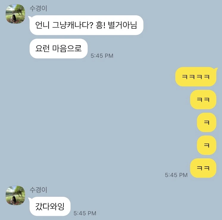 친구의 깨발랄한 한 마디에 굳어있던 얼굴이 풀어지며 풉 하고 실웃음이 새어 나온다.