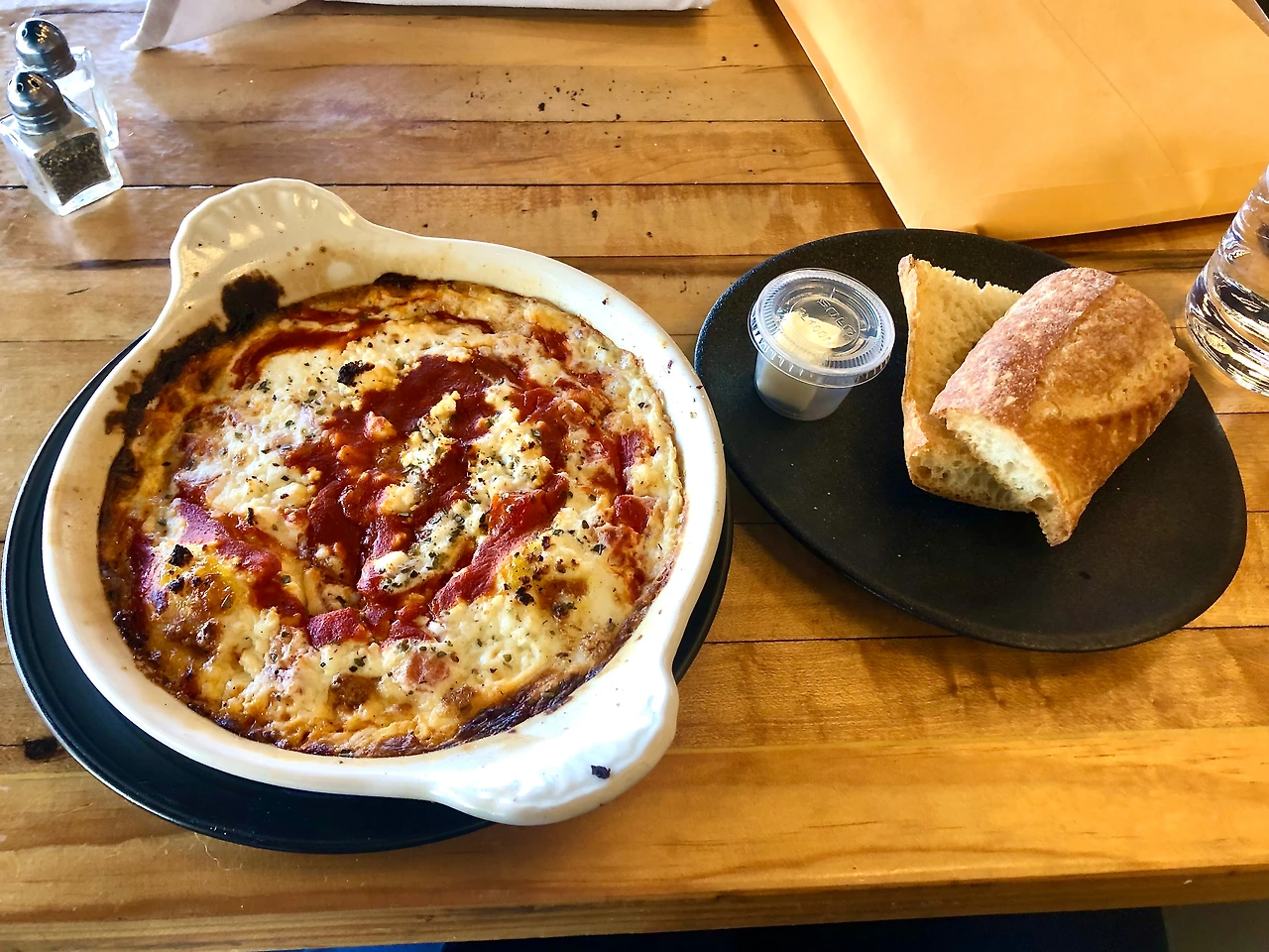 면접을 마치고 곧바로 Fabiane's 로 달려갔다. 전형적인 카페테리아로 특별할 것이 없어 보이지만, 나는 이곳을 뉴욕을 여행할때마다 시간을 내서 찾는다. 내가 좋아하는 Baked Eggs with Tomato & Feta를 먹기 위해서다. sun-dried Tomato라고 태양에 말린 토마토를 feta 치즈와 계란 2~3개 섞어 오븐에 바삭바삭하게 굽는다. 서빙할 때는 바게트와 함께 버터도 함께주는데, 토마토의 감칠맛과 치즈와 버터의 고소함이 아주 잘어울린다. 최고다.