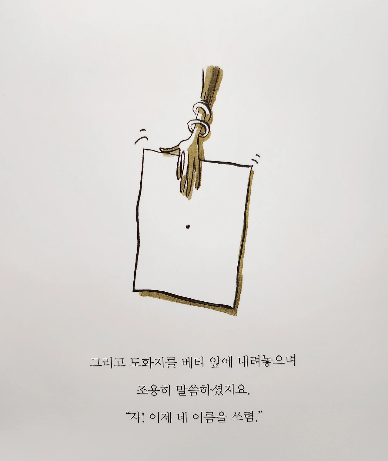 처음 이 책을 읽었을 때는 선생님 입에서 ‘이게 다야? 조금 더 그려봐, 무엇이라도 좋아, 점으로 무얼 만들 수 있을까?’ 정도의 부추기는 말이 나올 줄 알았습니다. 그런데 베티의 그림 자체를 존중하고 이름을 남기는 것으로 마무리하더라고요. 심지어 점 하나와 베티 이름이 적힌 도화지를 금테 액자에 끼워 벽에 걸어두어요. 다른 친구들이 보면 부러워할 수도 있겠지만 베티에게는 엄청난 동기부여가 되었죠. 물론 베티는 감동을 받기보다 더 멋진 점을 그릴 수 있다며 화를 냈지만요.