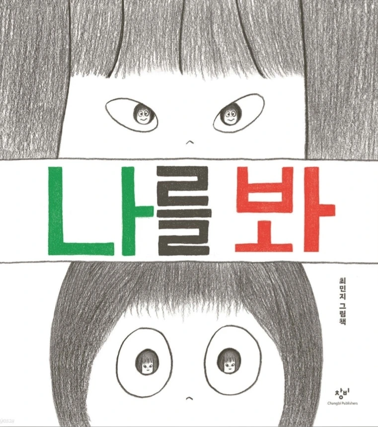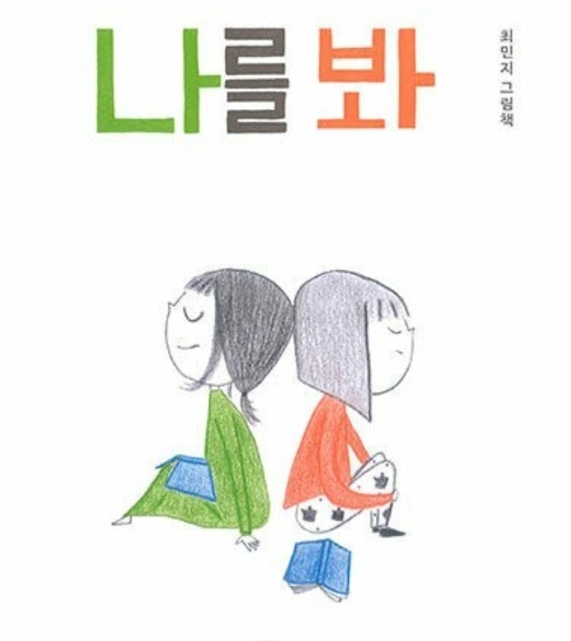 오늘은 본문이 아닌 표지를 가져왔는데요. 강렬한 첫인상을 가진 그림책 '나를 봐'입니다. 겉표지에는 서로를 바라보고 있는 두 아이가 등장합니다. 반면 속표지에는 등을 진 두 아이가 눈을 감은 채 편안히 앉아있네요. 눈을 맞추고 직접 바라보는 시간이 쌓여야 눈을 감고도 통하는 사이가 될 수 있다는 걸 표현한 걸까요?