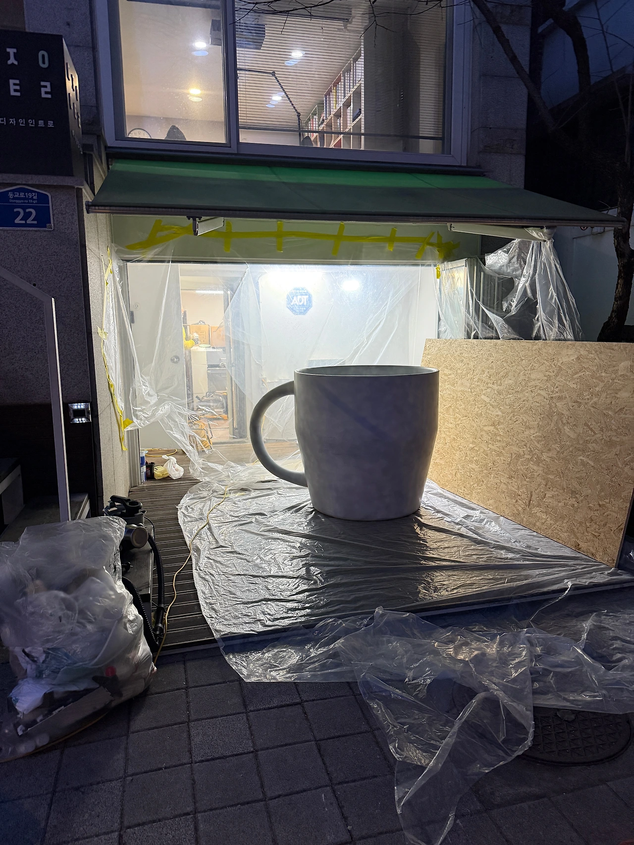 회사 마당에는 이미 도착한 직원들이 전날 하던 작업을 마저 하기 위해 철구조물을 옮기고 있었다. 온통 녹색으로 칠해진 철구조물은 열댓개가 넘어보이고, 마당 한 구석에는 키 큰 성인 남자가 들어가서 숨어도 될 만큼 커다란 머그가 떡하니 차지하고 있었다.