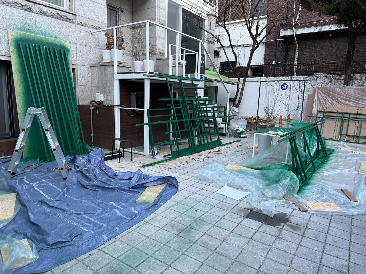 전시 준비를 하는 주말 내내 날씨는 야속하기만 했다. 수성 페인트가 미처 마르기 전에 떨어진 눈송이로 얼룩이 지고 눈이 그치기를 기다려 덧칠하면 또다시 눈발이 날리고, 그러다 모두가 지쳐서 배달 온 식사를 아무 말없이 먹을 땐 약올리듯 맑게 갠 하늘, 식사를 마치고 페인트붓을 들면 또다시 내리는 눈... 날씨 아니어도 충분히 힘든데 오락가락하는 날씨 때문에 더 힘들었던 작업. 이틀 동안 정신줄 놓을 정도로 고생한 직원들은 한동안 스타벅스에 가지 않을거라고 한다. 아마 나도..?