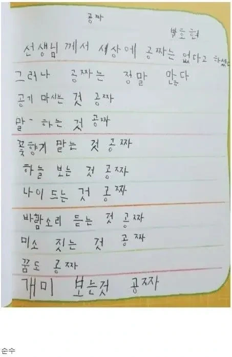 어느 초등학생이 지은 <공짜>라는 제목의 근사한 시는 미소를 잊고사는 어른들을 일깨운다.