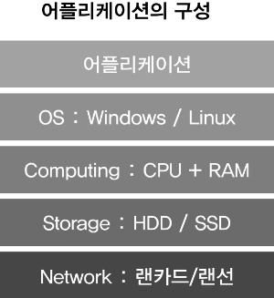 일반적으로 어플리케이션은 Storage, CPU와 같이 무엇인가를 저장할 수 있는 Computing, Operation System의 약자인 운영체제, Network를 위한 장치들이 쌓여서 구성된다.