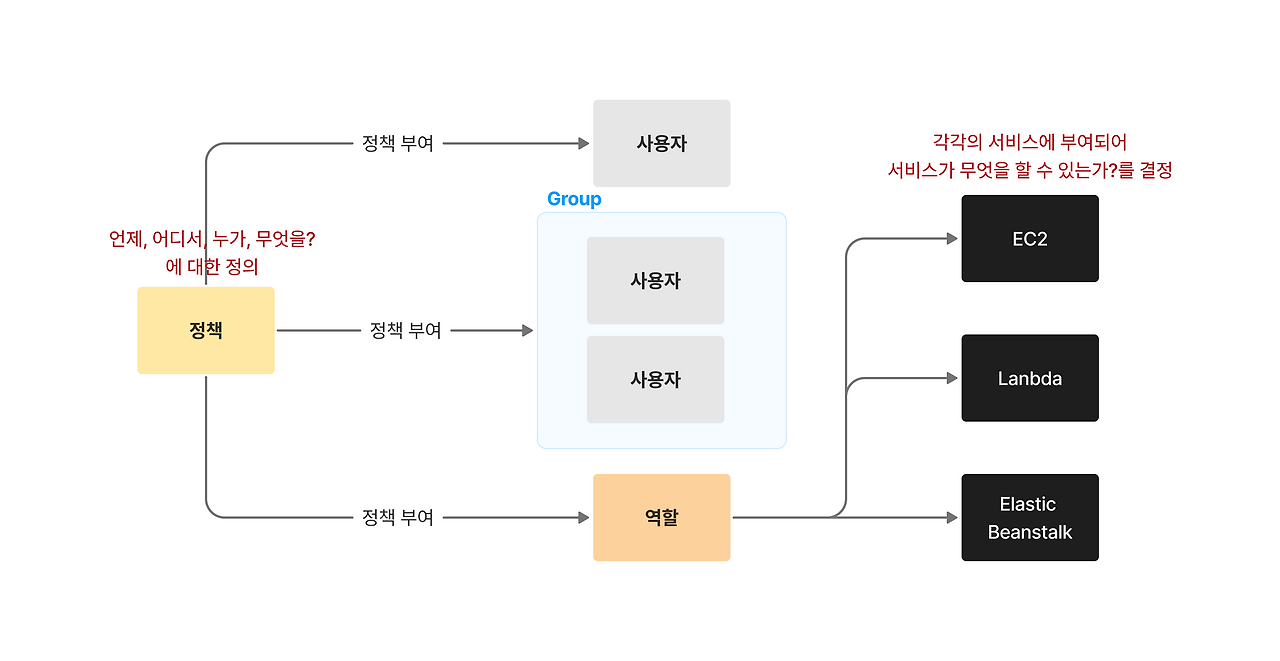 ex) 관리자는 모든 정보를 열람할 수 있다. 개발팀은 EC2 인스턴스만 만질 수 있다. 회계팀은 S3의 회계자료를 열람만 할 수 있다. 등 ..