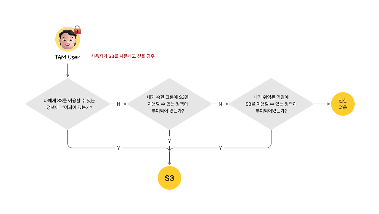 IAM은 위와 같이 사용자 → 그룹 → 역할 순서의 로직으로 권한을 검증한다.