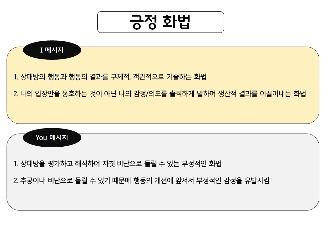 심리학자 Thomas Gordon에 의해 창시된 화법으로, 상대방의 감정을 건드리지 않으면서 긍정적으로 건설적인 이야기를 잘 전달할 수 있는 화법 기술입니다.