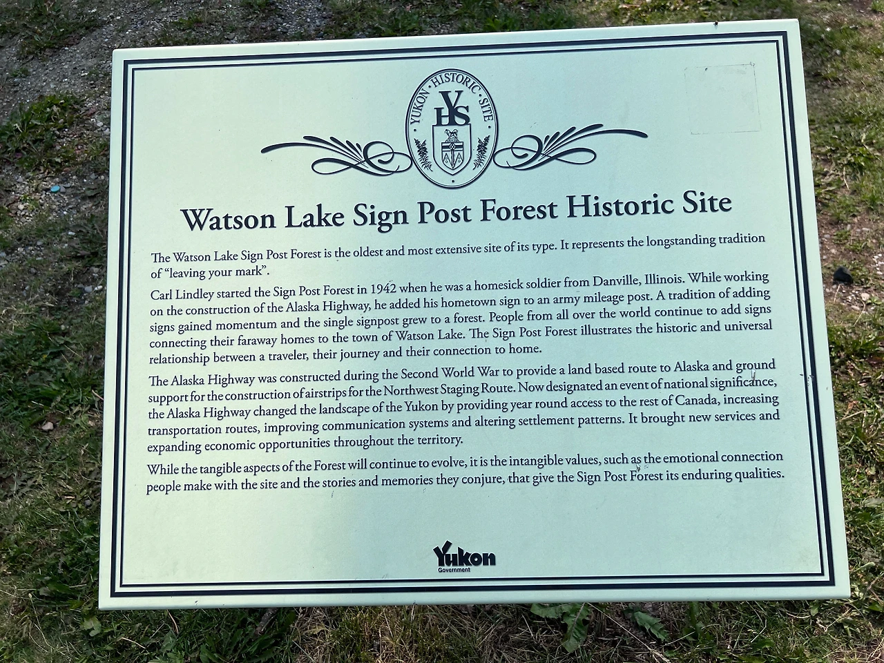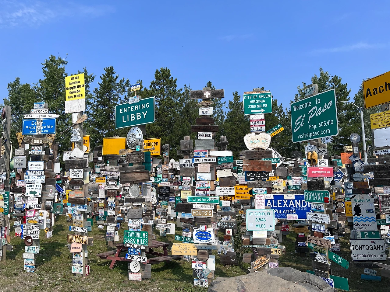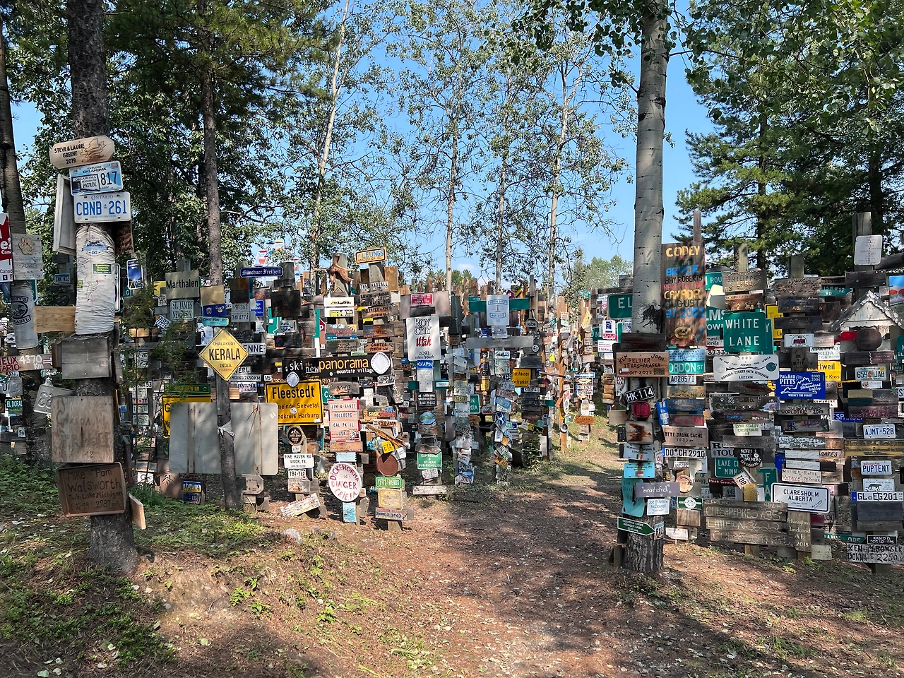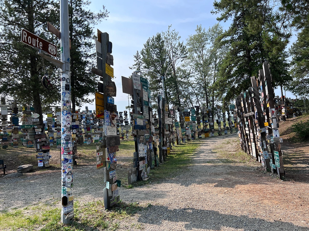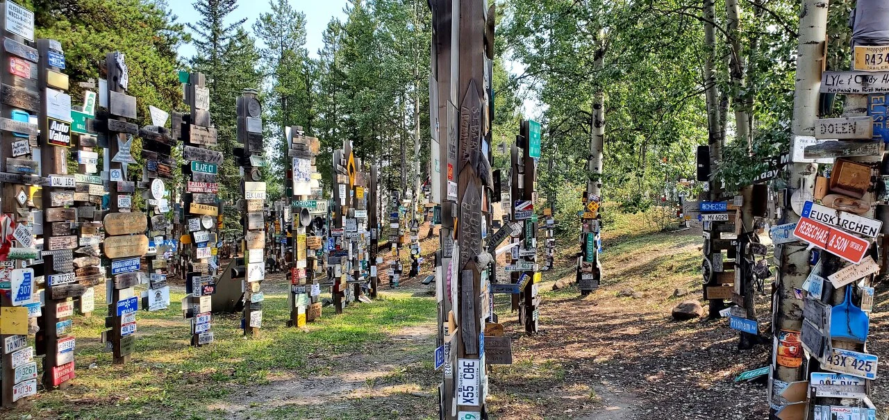 캐나다 유콘 지역의 Sign Post Forest는 1942년 미군이 알래스카 고속도로를 건설하던 시기에 시작된 전통입니다. 한 미군 병사가 고향을 그리워하며 자신의 고향 방향과 거리를 나타내는 표지판을 설치한 것이 시작이었고, 이후 방문자들이 자신들의 도시와 나라를 나타내는 표지판을 추가하면서 수천 개의 표지판이 모인 독특한 명소로 발전했습니다. (by chatGPT)