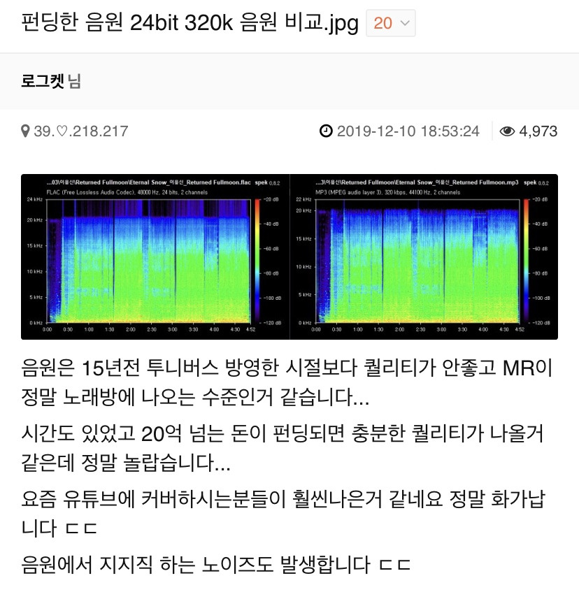 이에 대한 근거로서 주파수 대역대의 스펙트럼을 제시하고 있다. 나는 마스터링 엔지니어가 아닌 탓에 스펙트럼만 보고서 이에 대해 문제가 있다 없다 말할 수 없다. 다만 내가 아는 것은 스펙트럼만 보고서 얻을 수 있는 정보값은 거의 없다는 점이다. 스펙트럼은 어디까지나 음악 data에 관련한 여러 정보값 중 하나다. 음원을 만드는 사람의 입장에선 참고를 할 뿐이지 어떤 절대적인 기준을 제시해주는 값들이라 할 순 없다. 레코딩 시에 샘플 레이트를 높여 받는 이유는 있겠지만 48khz로 하건 96khz로 하건 그 이상으로 하건 가청주파수인 20khz 이상의 대역은 원래 꽉 차있지 않은 것이 일반적이다. 들리지 않을 뿐더러 20khz 이상 대역대의 소리가 나는 악기 자체가 거의 없기 때문이다. 요지는 스펙트럼으로 음질을 판단할 수 없다는 것이다. 최소한 '객관적으로 끔찍하게 나빠졌다.'고 서술할 순 없다.