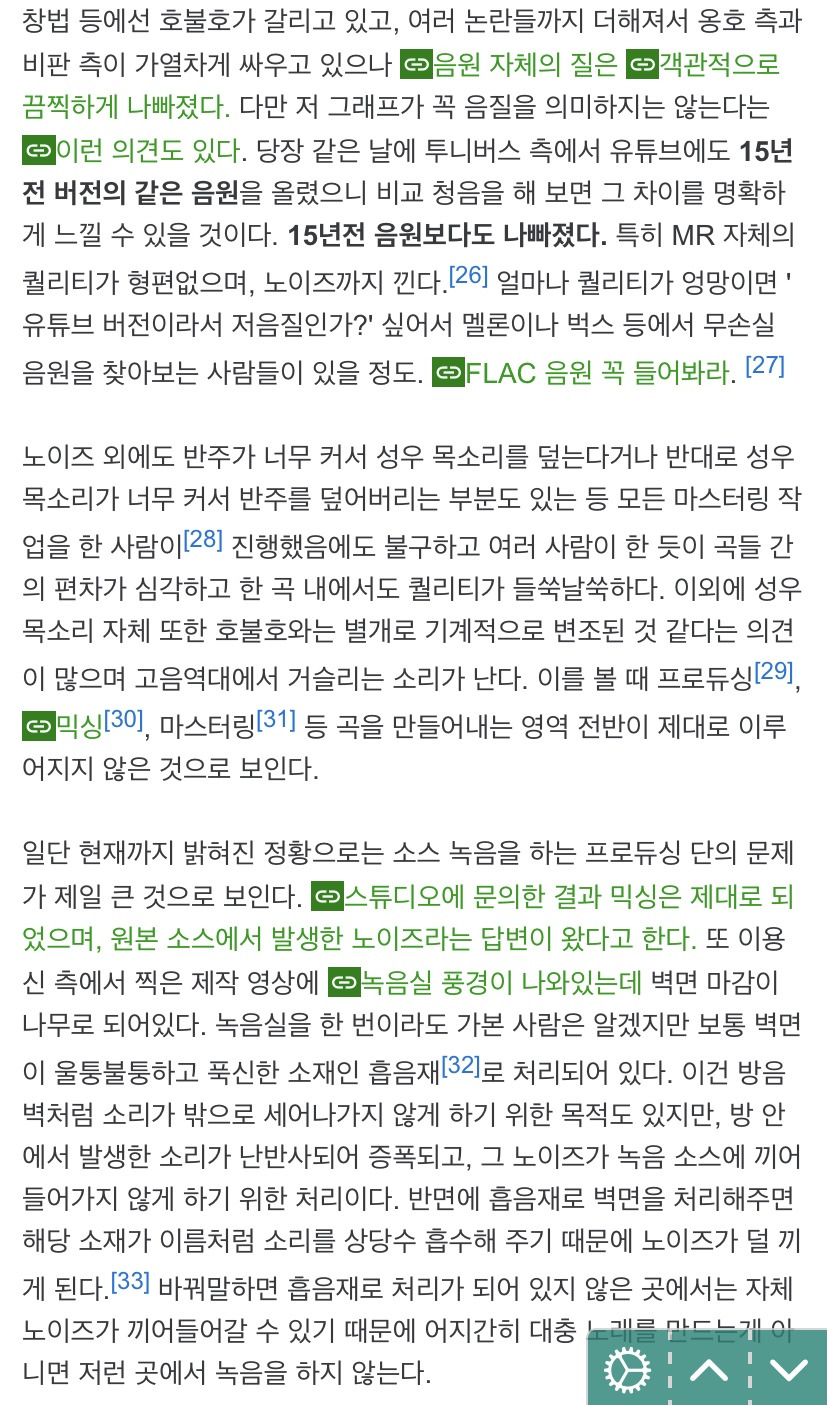 "제작 영상에 녹음실 풍경이 나와있는데 벽면 마감이 나무로 되어있다. 녹음실을 한 번이라도 가본 사람은 알겠지만 보통 벽면이 울퉁불퉁하고 푹신한 소재인 흡음재로 처리되어 있다. (…) 어지간히 대충 노래를 만드는게 아니면 저런 곳에서 녹음을 하지 않는다. (…) 방 안에서 발생한 소리가 난반사되어 증폭되고, 그 노이즈가 녹음 소스에 끼어들어가지 않게 하기 위한 처리이다."