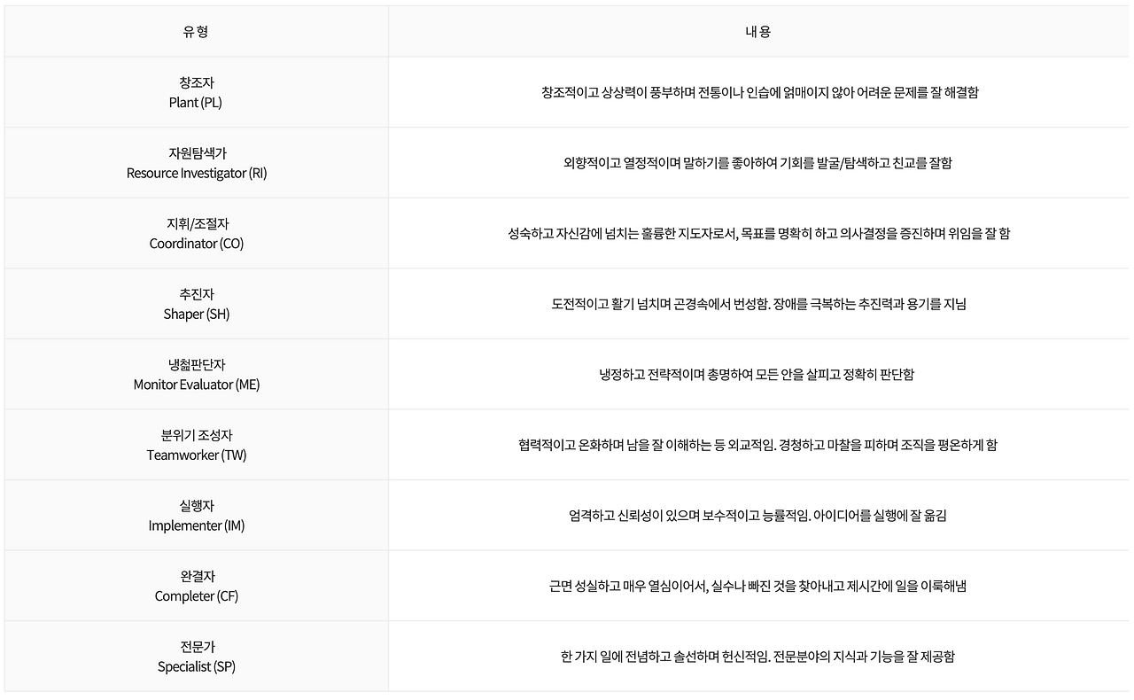 내가 가진 주요 역할을 팀역할검사를 통해 알 수 있는데 이 역할들은 크게 선호역할, 잠재역할, 비선호역할로 나눌 수 있다.