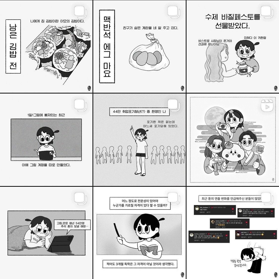 시시각각 변하는 인스타툰의 소재 역시 매 순간 방향성을 잡으려 노력하는 나를 적나라하게 드러냈기에, 인스타툰의 소재 자체가 나이기에 툰 소재를 고민하는 것은 곧 내가 무엇을 이루고 싶은지 그 답을 찾는 과정이었다. 그래서 참, 그마저도 좋다 싶었다.