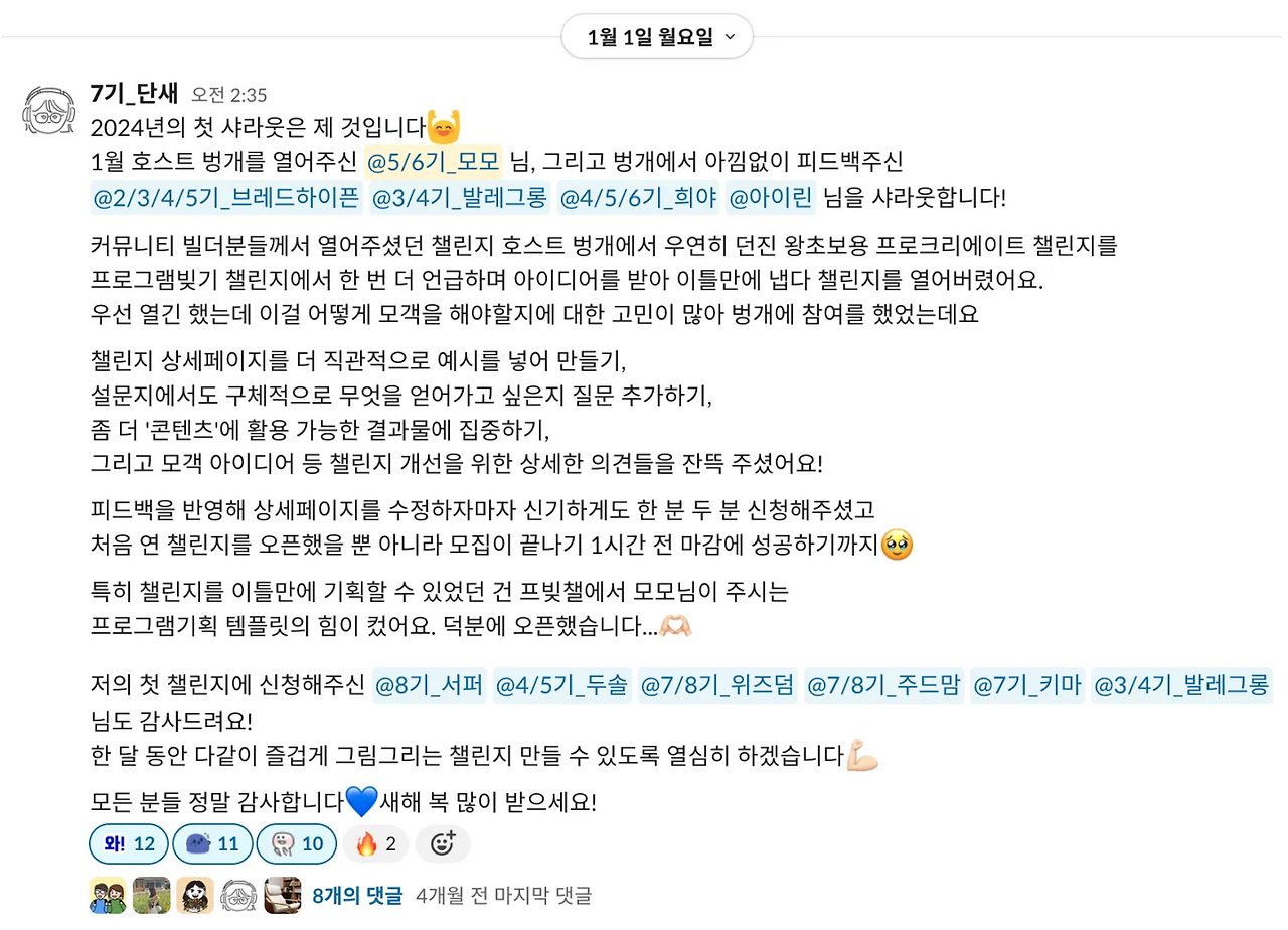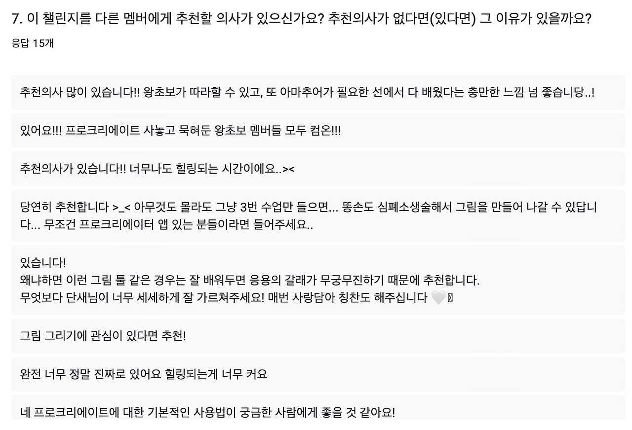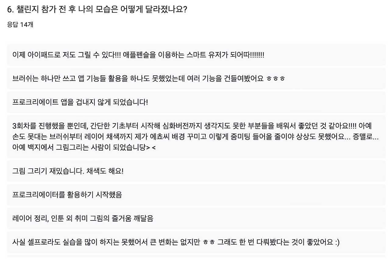 막상 챌린지를 열고 처음 진행을 앞두었을 때는 잘할 수 있을지 걱정에 불안했지만, 챌린지를 진행하며 나도 정말 많이 배웠다. 멤버들이 배움을 얻어가는 모습과 그림을 즐기는 과정을 지켜보며, 내가 알고 있는 것을 나누는 과정이 성장의 계기가 된다는 사실을 깨달았다. 이후 4회에 걸쳐 챌린지를 진행하며 커리큘럼을 계속 업데이트했고, 피드백을 반영하며 완성도를 높일 수 있었다.