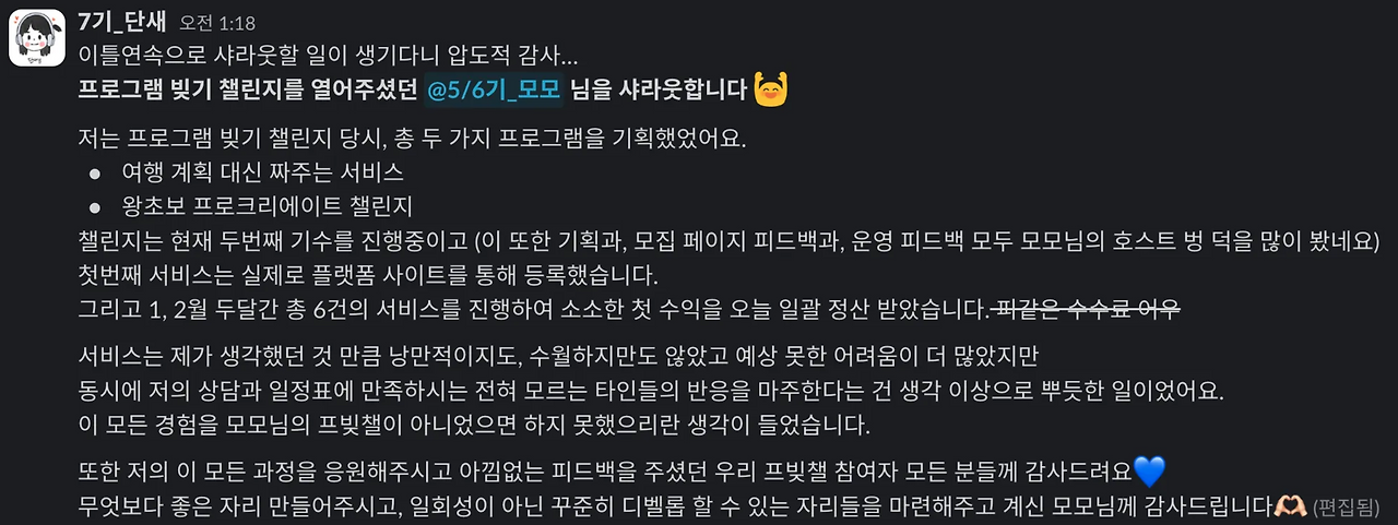 챌린지를 연 것이 아닌 참여한 것조차 시도가 되기도 한다. 모모님의 프로그램 빚기 챌린지에 참여했을 때였다. 이 챌린지의 목표는 각자가 좋아하거나 잘하는 것을 프로그램으로 만드는 것이었다.