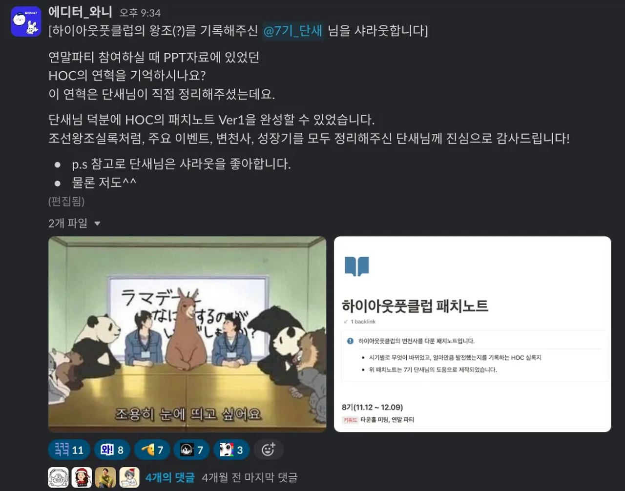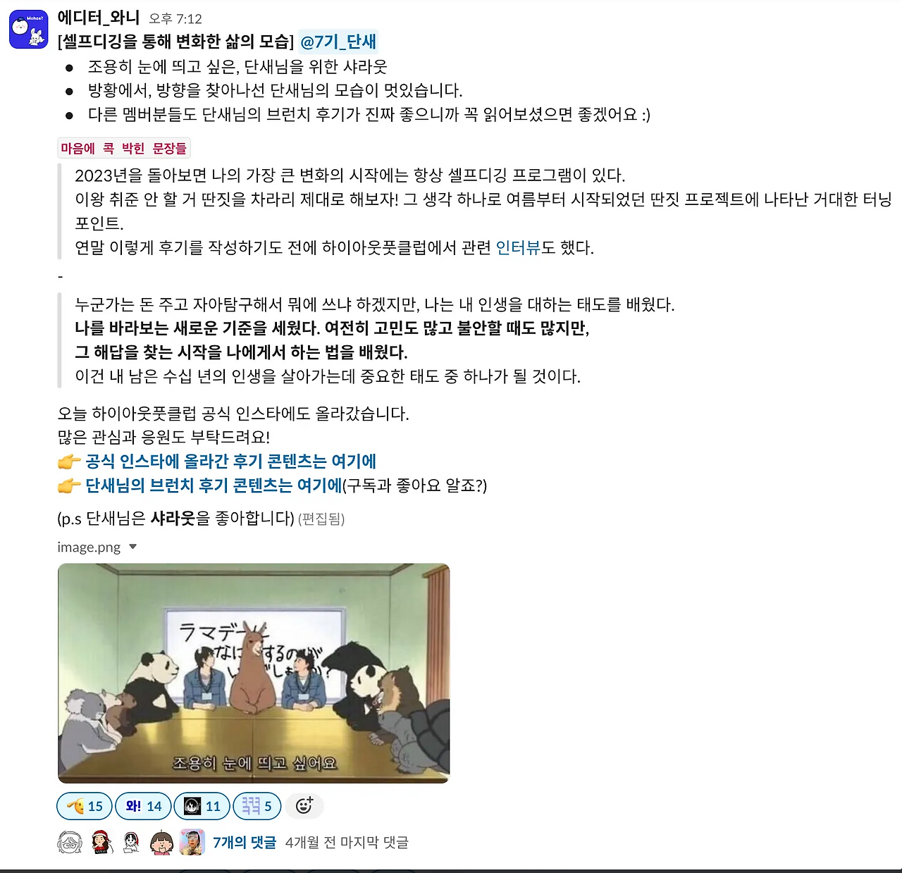 위에 적은 시도들 외에도 참 다채로운 일들을 했다. 하이아웃풋클럽 블로그에 내 닉네임을 검색해 보니 곳곳에 등장하는 게 나 제법 잘 지냈었구나 싶다. 아예 내가 연사자로 참여했던 하이아웃풋클럽 전단계 프로그램인 셀프디깅데이에 대한 대한 글도 있었는데 사라져서 아쉽다 (내가 썼던 후기라도 살짝). 생각해 보니 브런치 작가 신청도 하이아웃풋클럽 후기를 쓰겠다고 도전해 통과했고, 작년 연말에는 연말파티 기획단으로 활동하기도 했다.