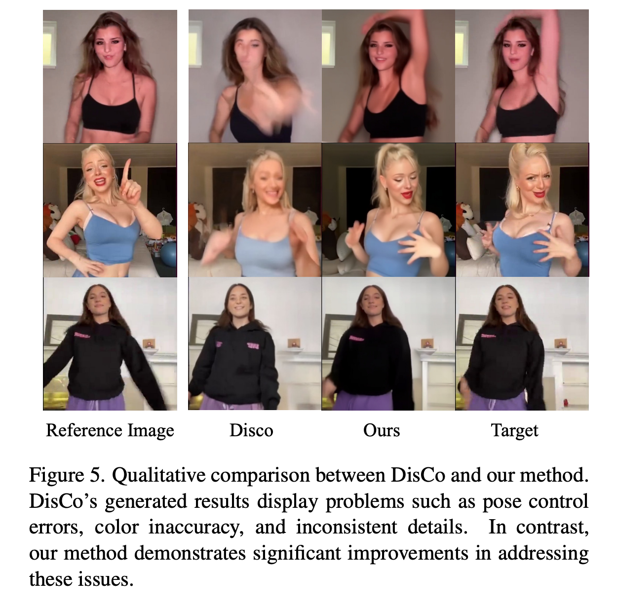 왼쪽부터 참고 이미지, 포즈 시퀀스, 최종 결과 동영상이다. 해당 논문에서 타모델과 비교한 것에서도 알 수 있지만, 상당히 안정적이라는 점이 인상적이다. 물론 섬세한 손동작, 사진에서 보이지 않는 부분에 대해 안정적으로 생성해내는 부분 등에서는 한계가 존재한다고 논문에서도 언급되고 있으나, 기존 모델과 비교해보면 이제는 정말 자연스럽다고 할 만하다.