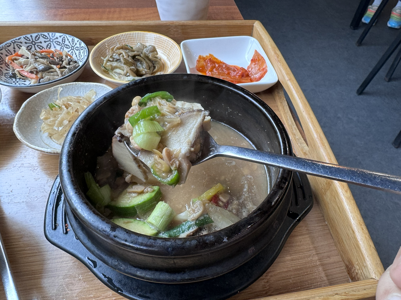 다만 아쉬운 건 걸어서 가기엔 조금 먼 거리랄까? (10분은 걸어가야 한다) 매일매일 바뀌는 메뉴에 딱 먹기 좋은 한상차림으로 부족한 밥과 반찬은 본인이 더 리필해서 먹을 수 있는 점까지.. 게대가 가격도 8000원 밖에 안 한다! 가게 이름도 직관적으로 <밥집>이다. 오늘은 메뉴는 내가 좋아하는 청국장이라 남은 잔반 없이 싹싹 비웠다. 다만 아쉬운 건 백반 한상은 점심에만 판다는 것이다.