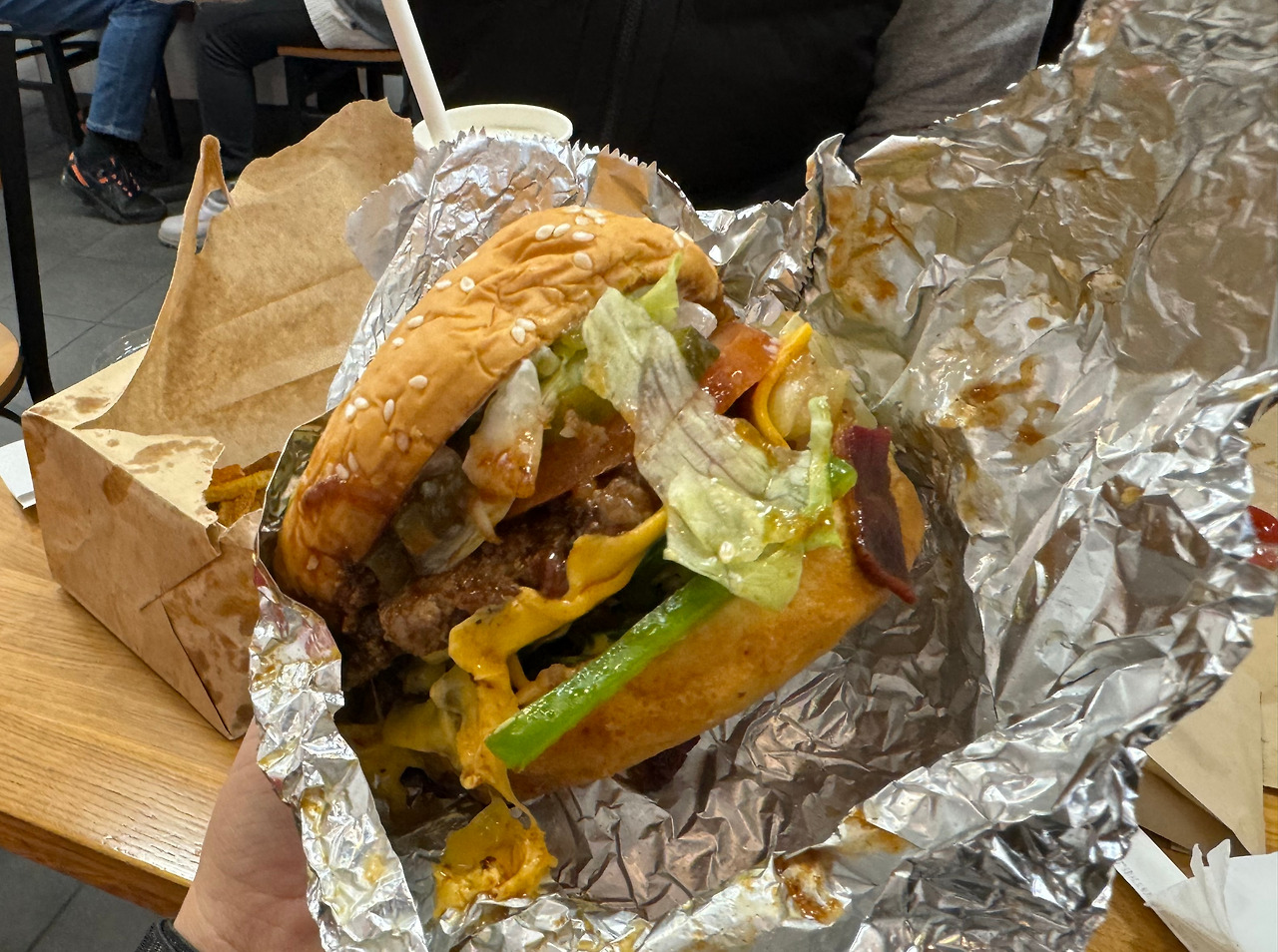 먼저 한번 다녀온 직원의 가이드에 따라 베이컨 치즈버거에 기본 토핑과 소스만 넣은 올더웨이, 모든 토핑과 모든 소스를 넣은 에브리띵을 골라서 주문했는데.. 체중관리 때문에 평소 점심으로 귀리셰이크, 양배추, 바나나 따위만 먹어온 나는 파이브가이즈 매장에 들어서자마자 이성을 잃은 나머지 모든 토핑과 소스를 넣은 에브리띵을 선택하고야 말았다. (그래도 양심이 있어서, 음료는 밀크셰이크는 선택하지 않고 제로콜라를 골랐다)