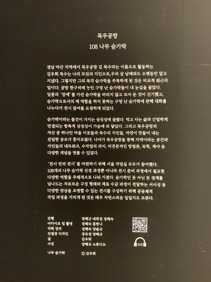 해당 전시의 이름은 '목우공방 108 나무숟가락'이다. 양혜규라는 사람이 기획한 전시로, 자신의 어머니의 지인인 김목수라는 이름으로 활동하는 김우희 목수의 숟가락 108개를 특징별로 모아 전시한 것이다. 양혜규의 전시 안에 한 켠에 마련된 '전시 안의 전시'인 것.
