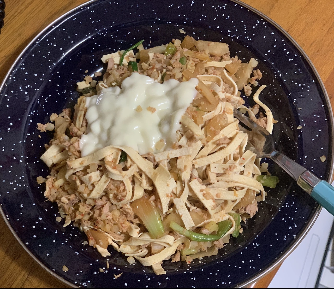 아보카도 오일에 실파와 마늘과 잘게 썬 김치와 역시 숭덩숭덩 썬 파김치를 볶습니다. 참치 반 캔 정도도 넣어요. 어디서 보니 뜨끈한 물로 기름을 빼주더라구요. 저도 그렇게 해봅니다(본 건 많아요). 콜리플라워 라이스도 넣고 볶아요. 볶아볶아 줍니다. 이제 면두부 넣을 차례. 면두부 넣고 소금, 간장, 들기름, 마늘가루로 간을 해줘요. 면 하나 건져서 간도 보구요. 그런데 너무 건조한 걸? 접시에 담고 후다닥 치즈 올리면 완성입니다.