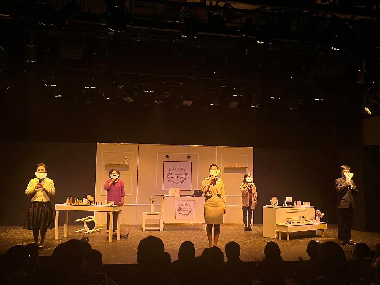 곧 연극이 시작되고, 유니폼을 입은 화장품 판매 사원이 등장했다. 한 명은 매니저였고, 한 명은 사원이었는 데, 이들은 계속 반품 및 교환을 요구하는 2명에 고객들에게 시달리면서도 마음의 가면을 쓰고 계속 웃어야 했다. 고객들은 이들을 집요하게 괴롭히는 데, 약간 분노조절 장애가 있는 사람 같았다. 어딘가에서 스트레스를 풀 곳이 없어서 괴롭히러 일부러 찾아오는 그런 느낌?
