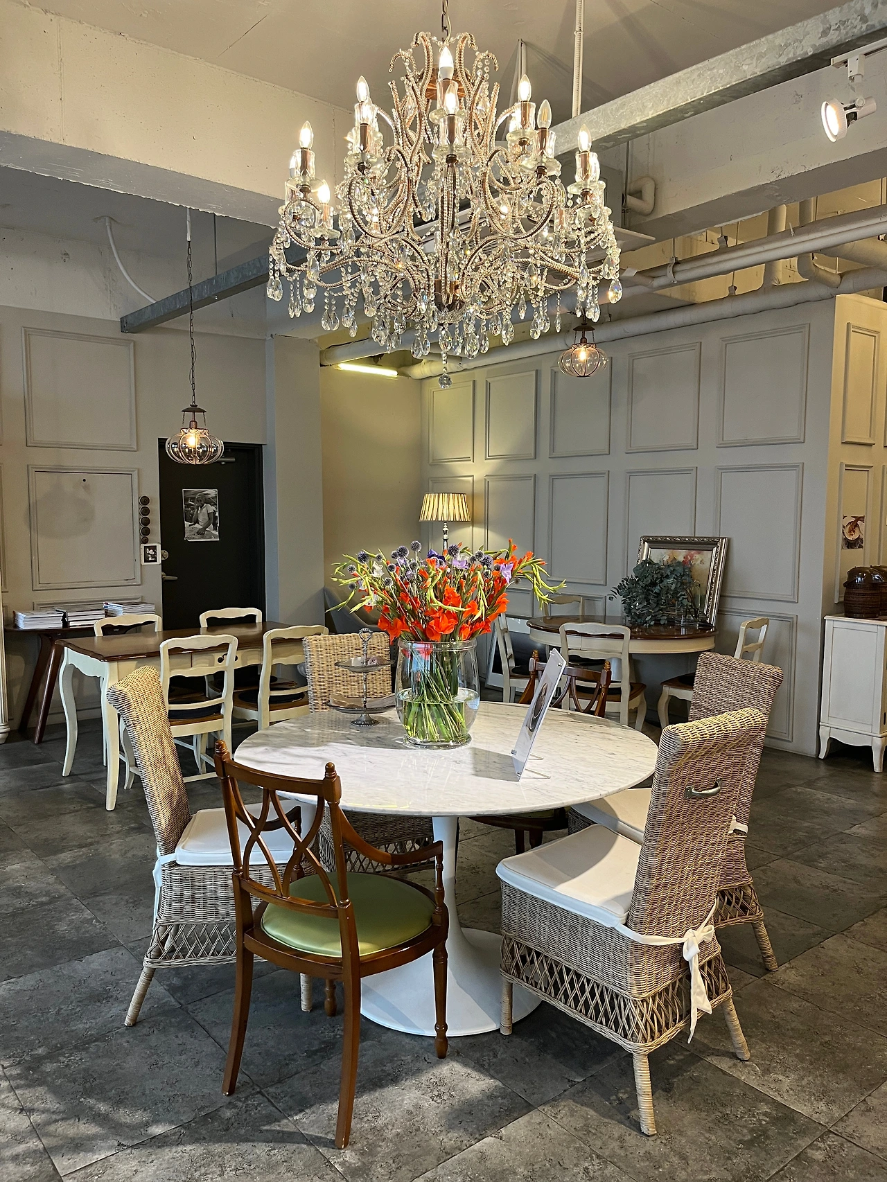 테이블의 샹들리에 무늬 타일 아트가 마음에 들었고, 초록색 줄무늬의 푹신한 쿠션이 좋았다. 테이블 위에는 빨간 구두를 신은 여자 사진이 놓여 있었는데, 무표정한 얼굴이 강한 인상을 남겼다.
