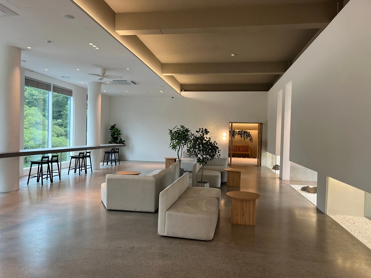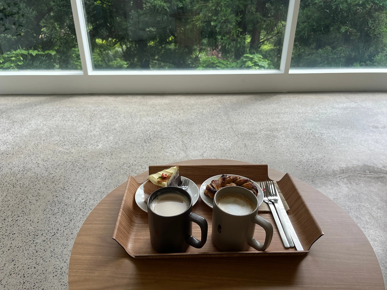 우리는 카페를 좀 더 구경하다가 짙은 초록색과 파란색 소파가 놓인 큰 방 같은 공간에 앉기로 했다. 통창 밖으로 보이는 숲 뷰가 기가 막혔다.
