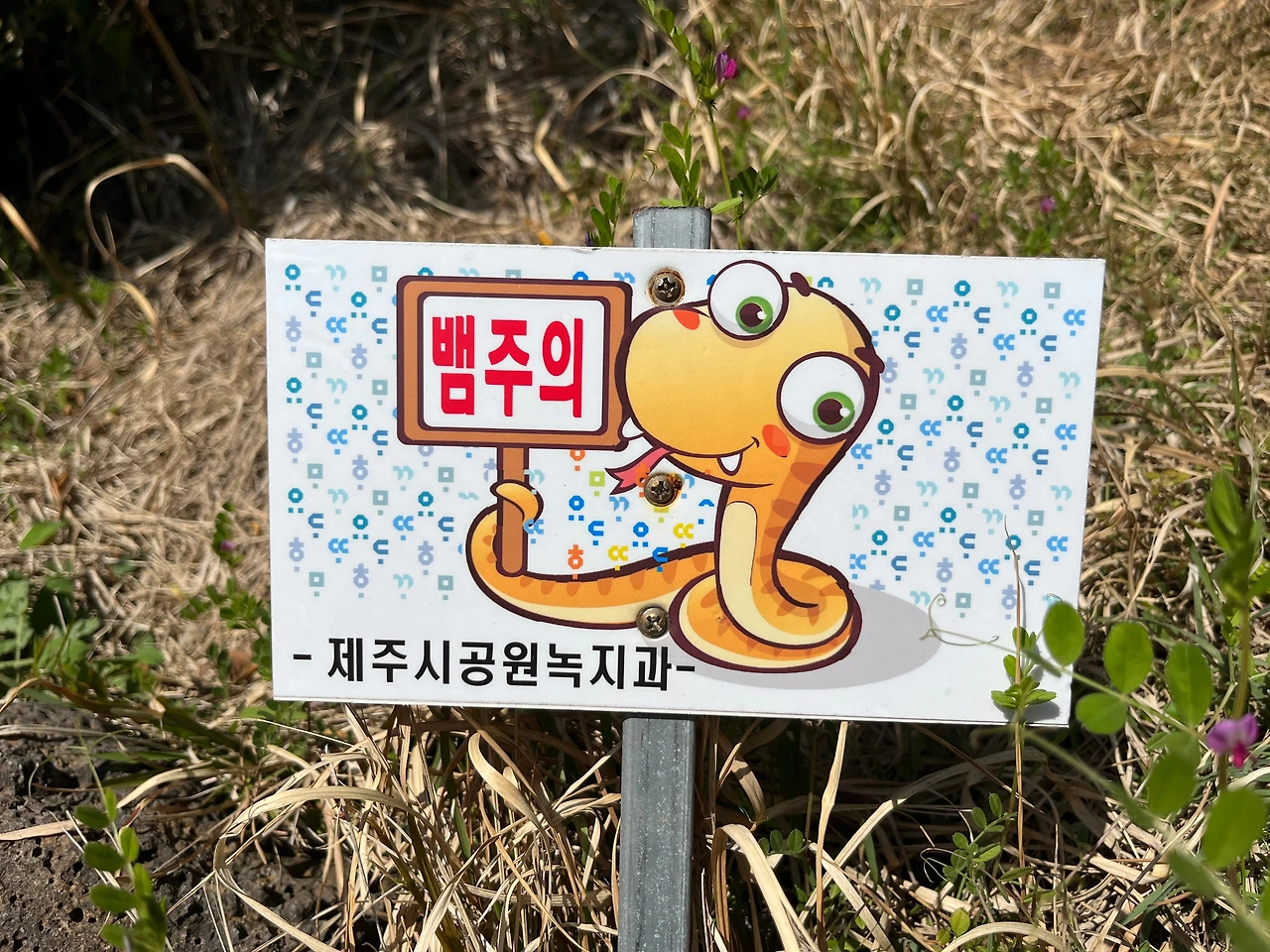 이 표지판을 어디선가 봤었는데 그게 어디인지 생각이 안 나던 차에 도두봉에서 다시 뱀 표지판을 만나니 반가웠다. <뱀 주의> 표지판은 제주공원녹지과에서 설치한 귀여운 뱀이 직접 뱀을 주의하라는 팻말을 들고 있는 표지판이다.