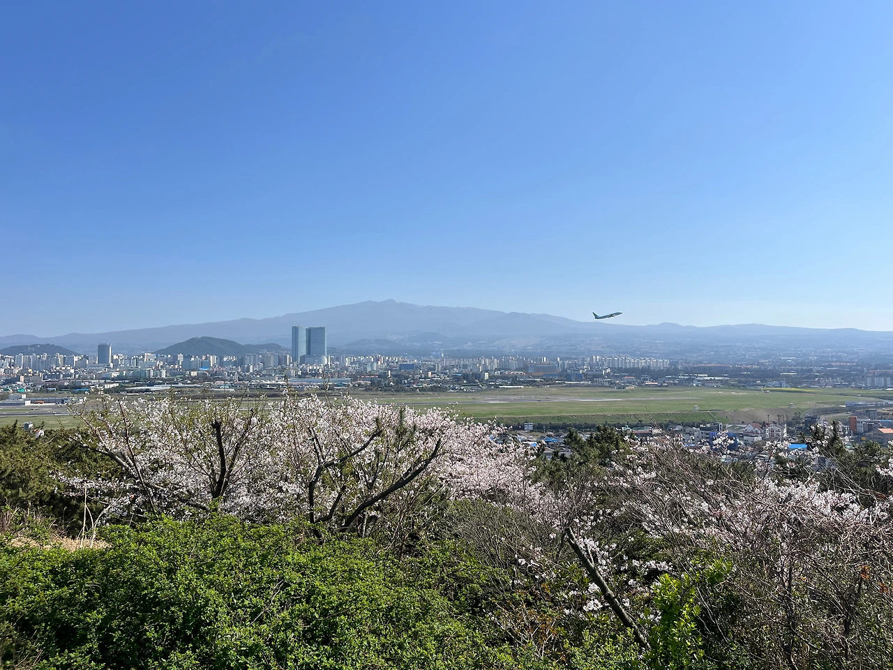 그렇게 나는 핸드폰을 들고 나를 반기는 한라산을 맘껏 찍었다. 파란 하늘 탁 트인 한라산 뷰, 벚꽃이 어우러져 도두봉은 장관을 이었다.