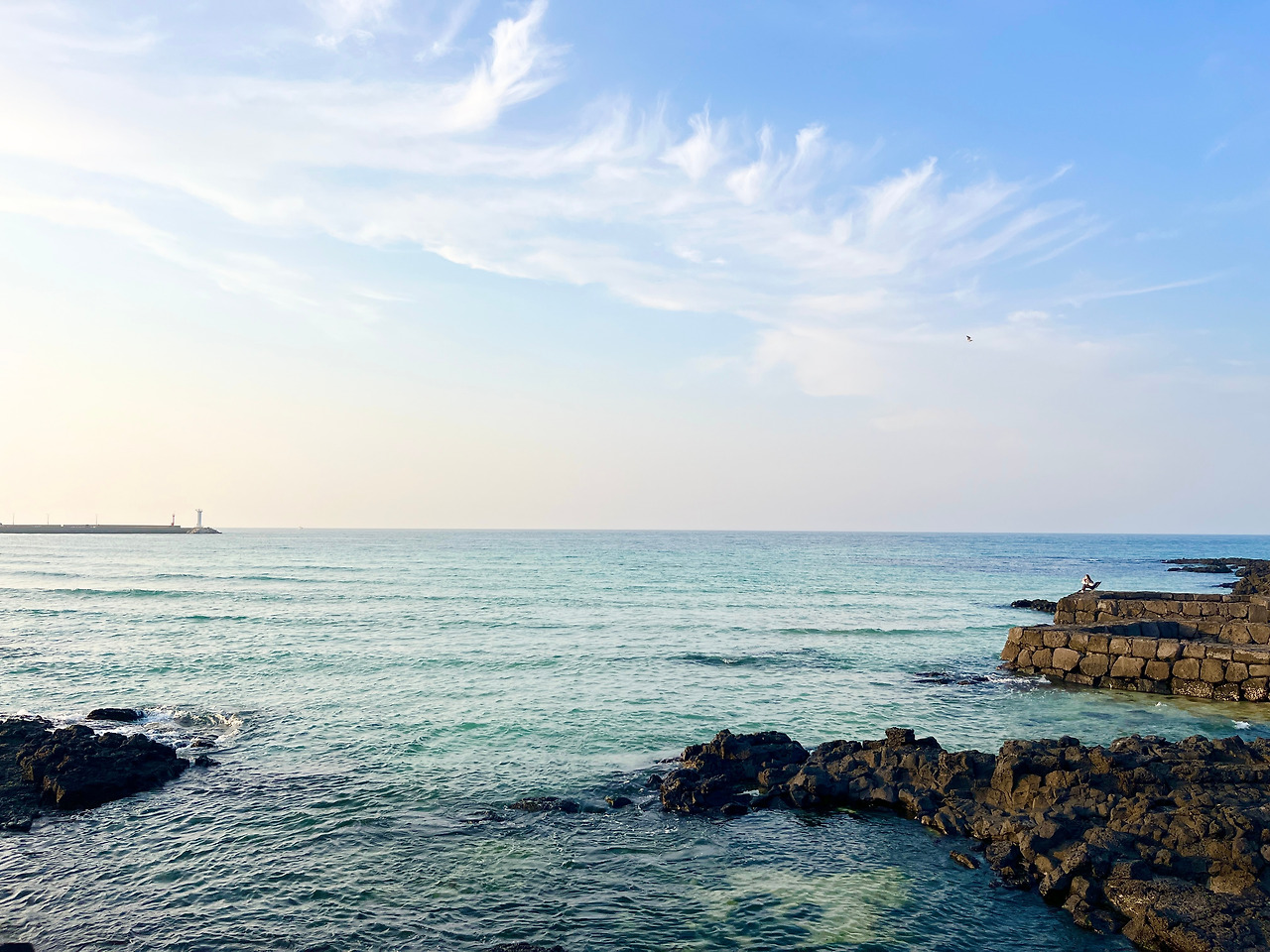그렇게 나는 세화해수욕장에 도착했다. 어느덧 저녁노을이 뉘엿뉘엿 지고 있었고... 어떤 사람이 바다 한가운데 있는 둑에 작은 의자를 놓고 앉아 있었다.