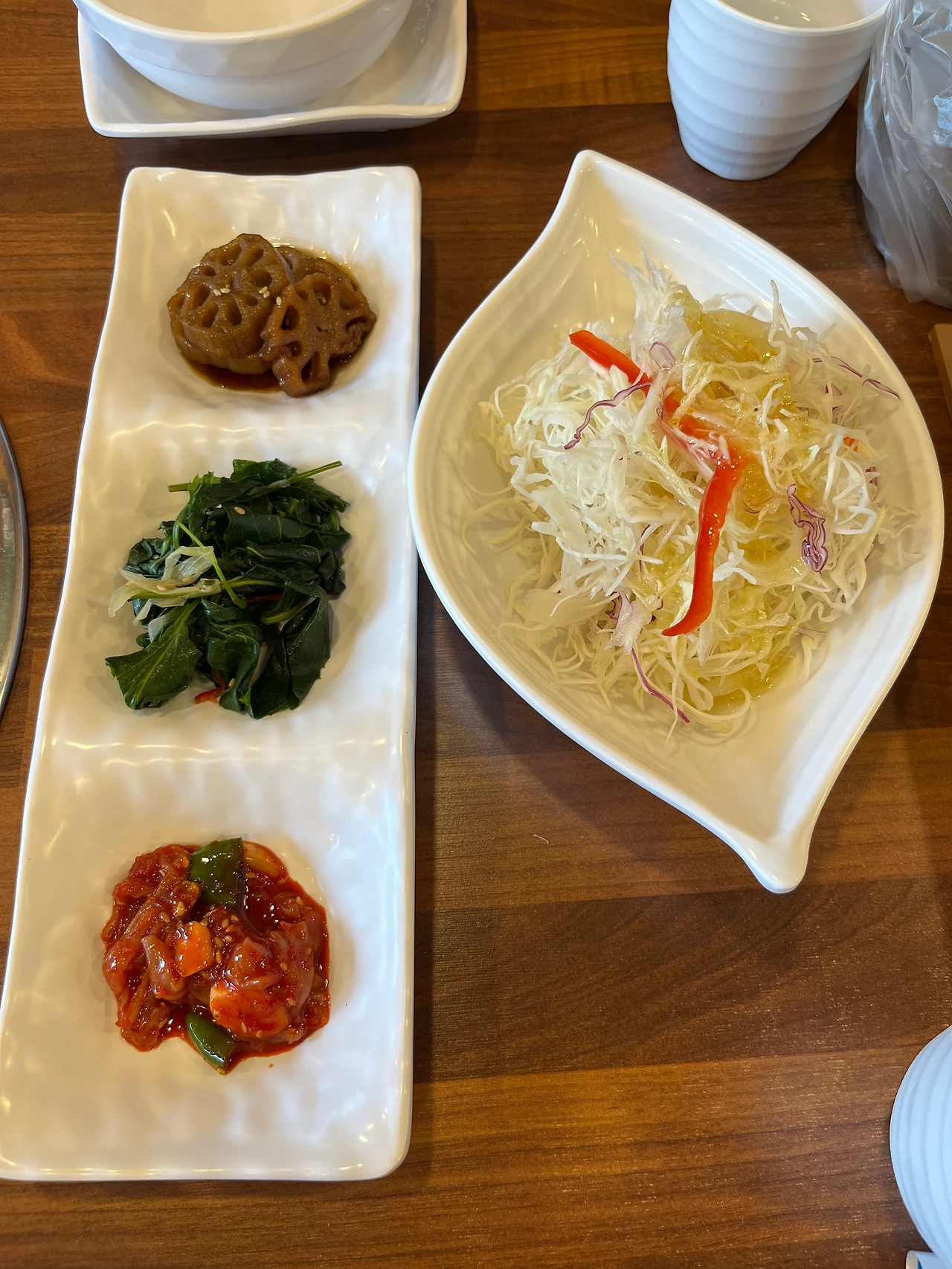 이런저런 생각을 하는 사이, 우리 테이블에도 음식이 나왔다. 양배추 유자 드레싱 샐러드와 오징어젓갈, 나물무침, 연근조림, 배추김치, 깻잎장아찌, 숙주나물과 고사리무침의 반찬이 먼저 나왔다. 나는 이중 내가 좋아하는 양배추샐러드를 한 입 먹었다. 양배추가 최대한 가늘게 채 썰어져 있어서 씹기 좋았고 유자 드레싱은 상큼했다.