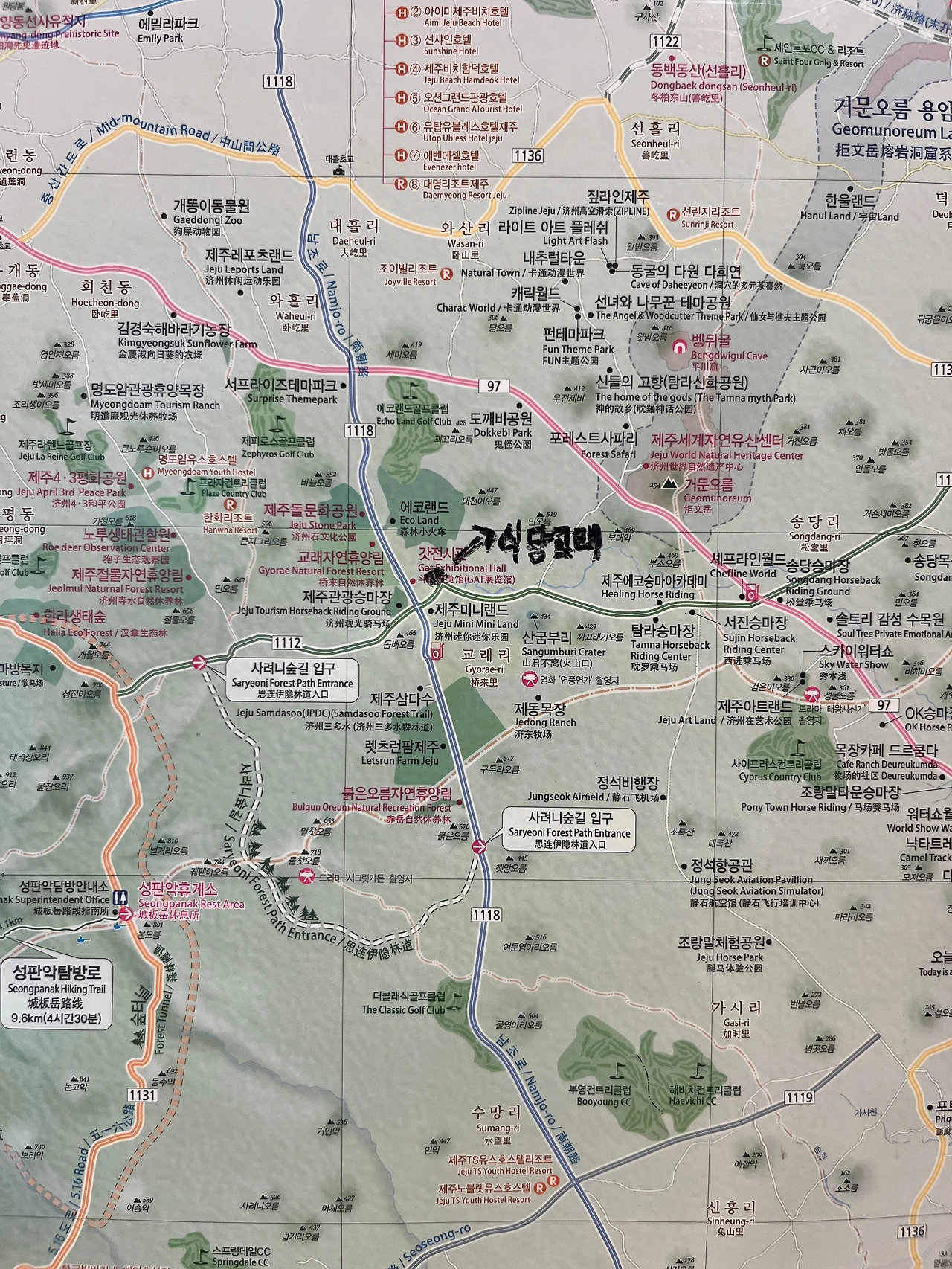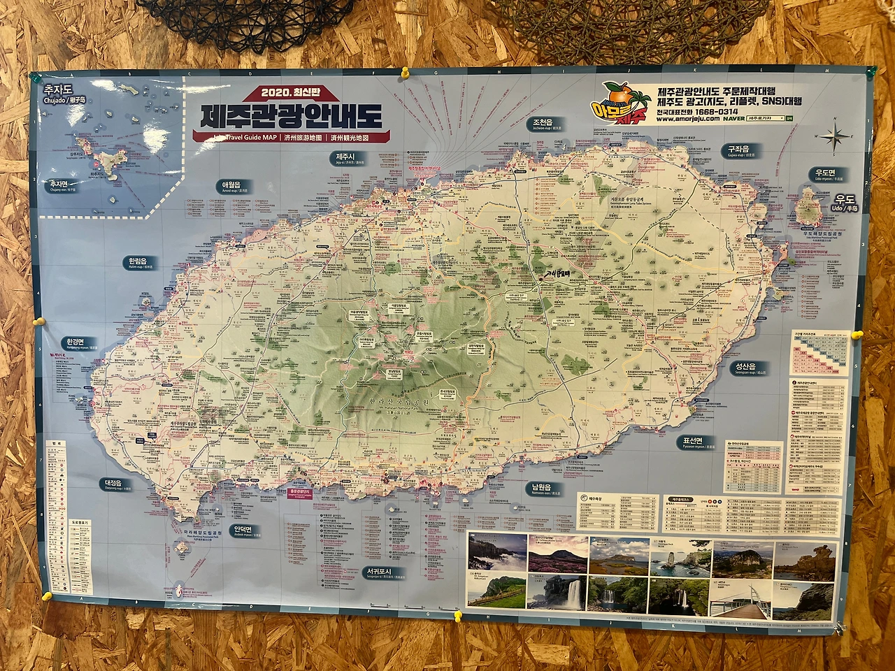 어차피 시간도 남는 김에 나는 식당 곳곳을 구경하기로 했다. 한쪽 벽에는 코팅된 대형 제주도 지도가 붙어 있고 그곳에 보드마카로 '식당교래'라고 표시된 부분이 보였다. 아날로그 방식에 이런 표기가 정말 정겨운 것 같아 사진 한 장을 찍었다.