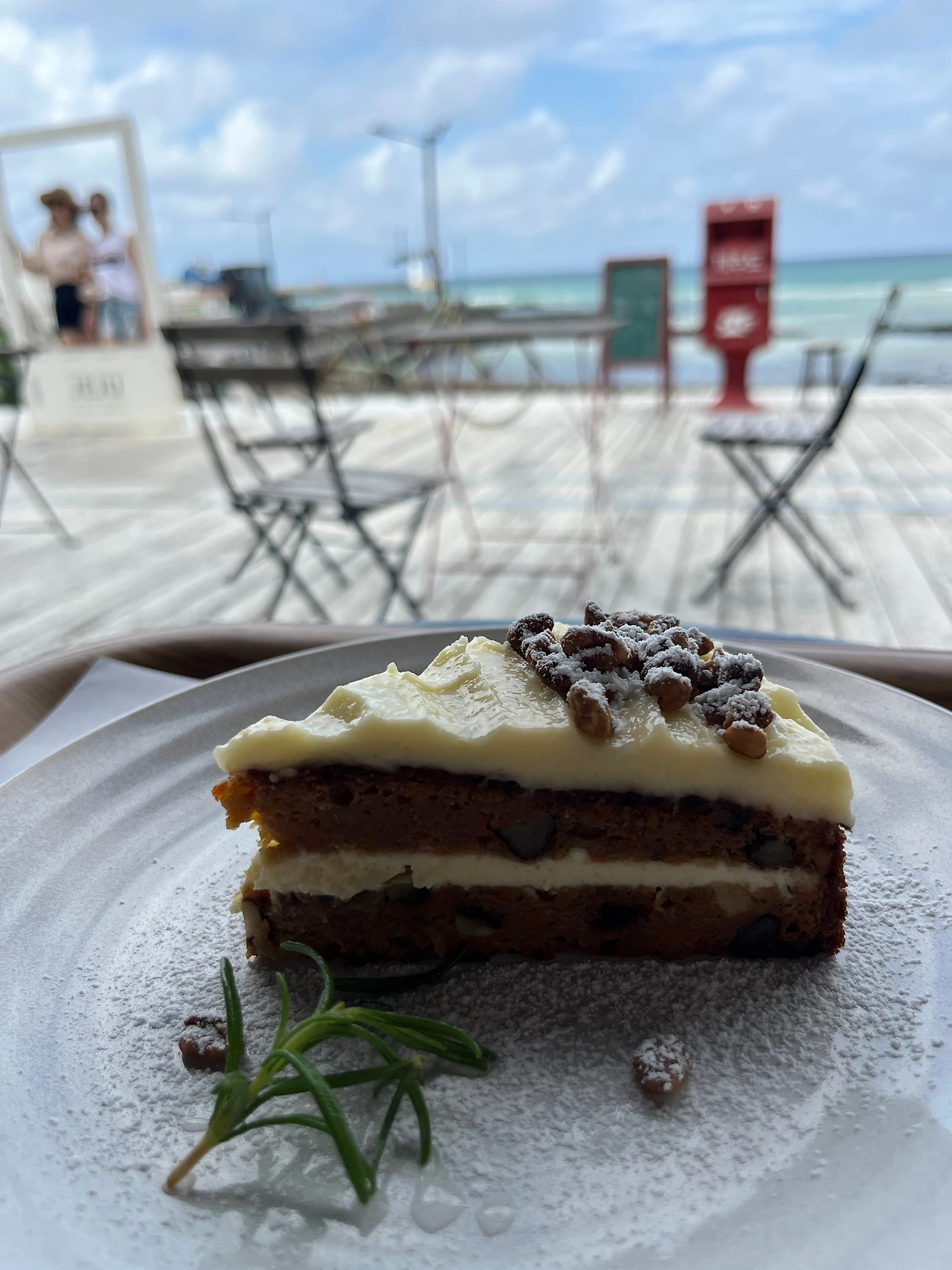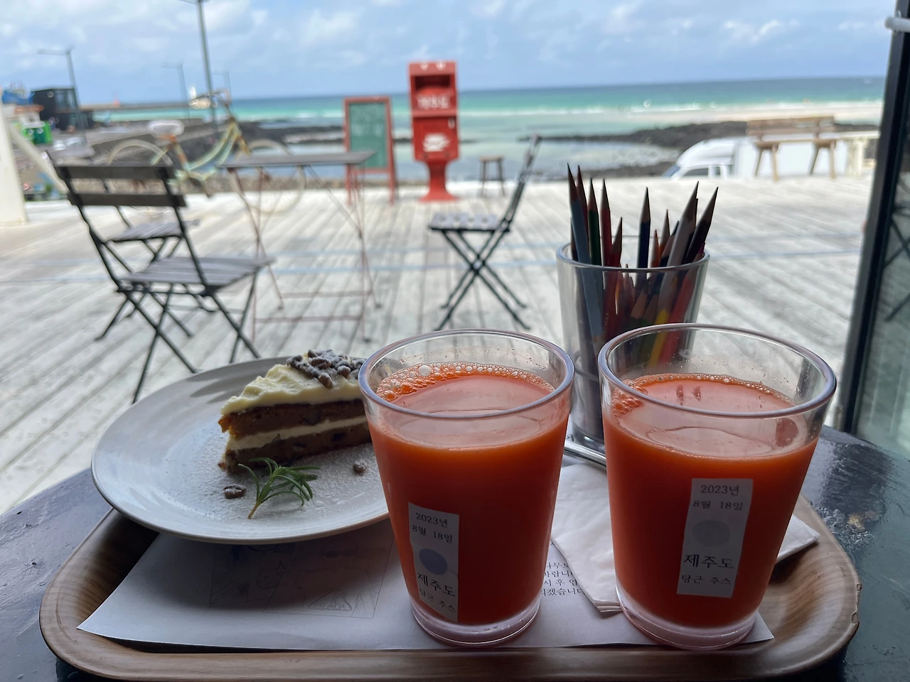 이야기를 나누는 중에 진동벨이 울렸고, 우리는 주문한 음식을 받았다. 당근 주스 2잔과 당근 케이크가 바다를 배경으로 예쁘게 어울렸다.